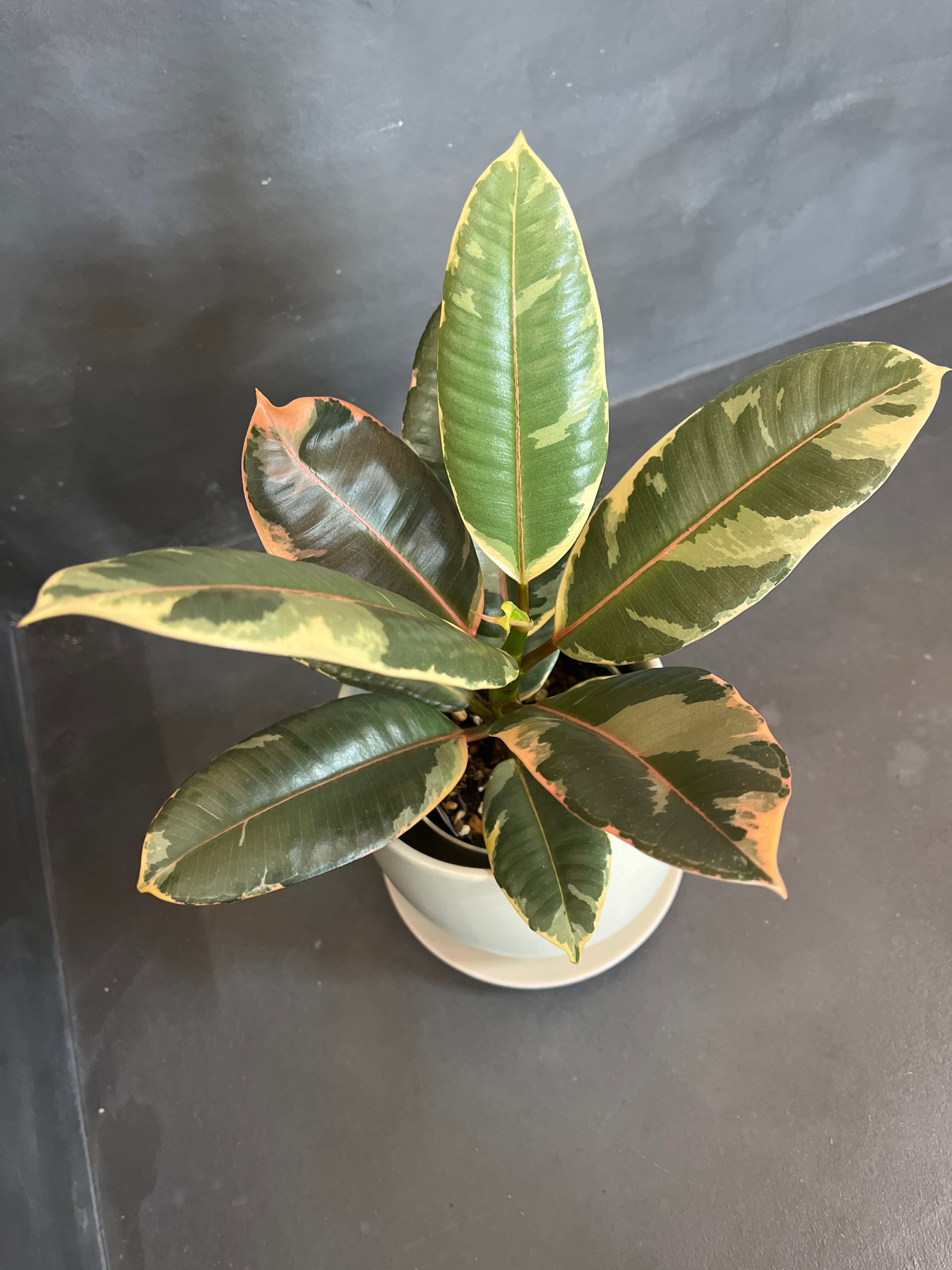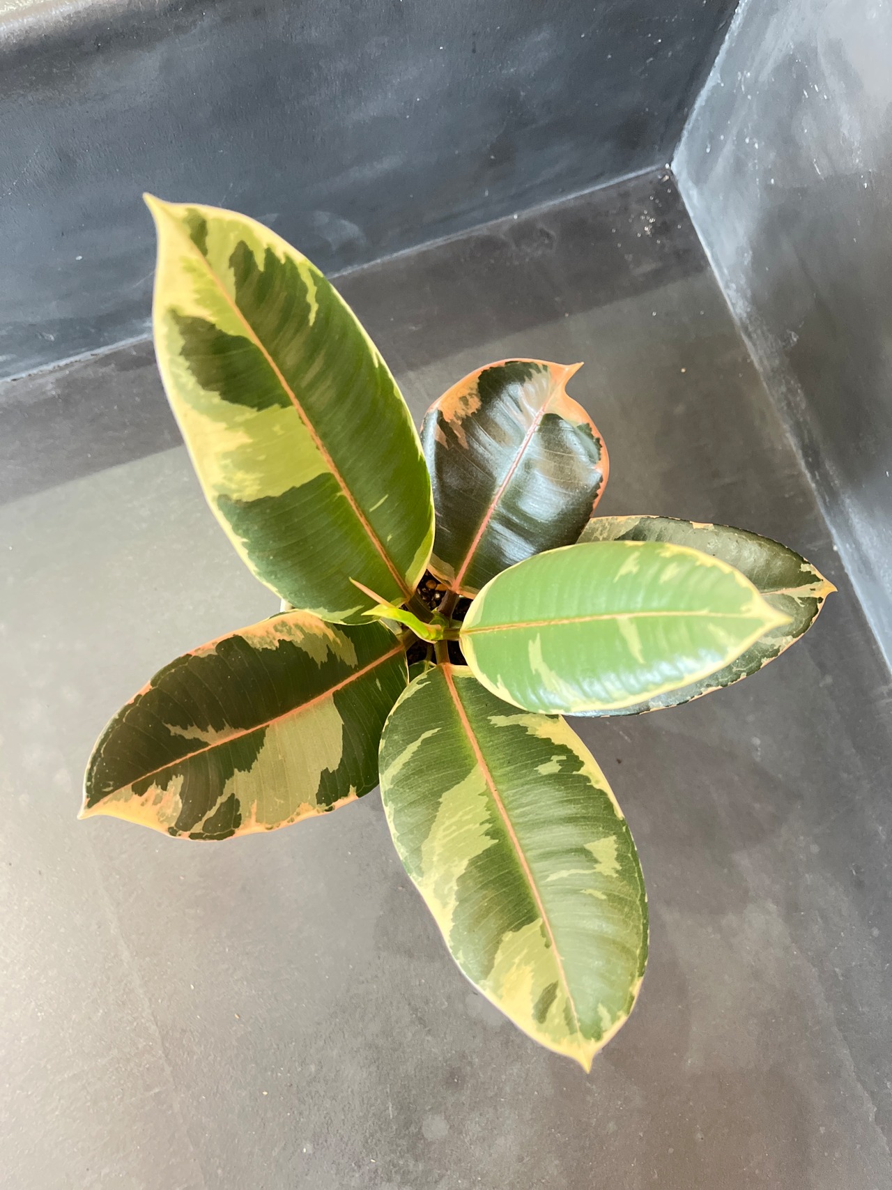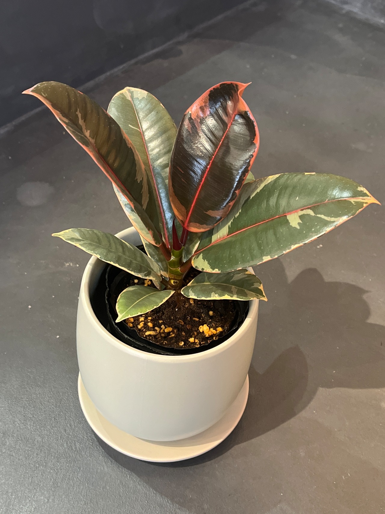 フィカス ルビーは、黄緑色の葉に赤ピンクの班が特徴的な観葉植物です。ゴムの木の仲間なので「赤ゴム」と呼ばれることも。