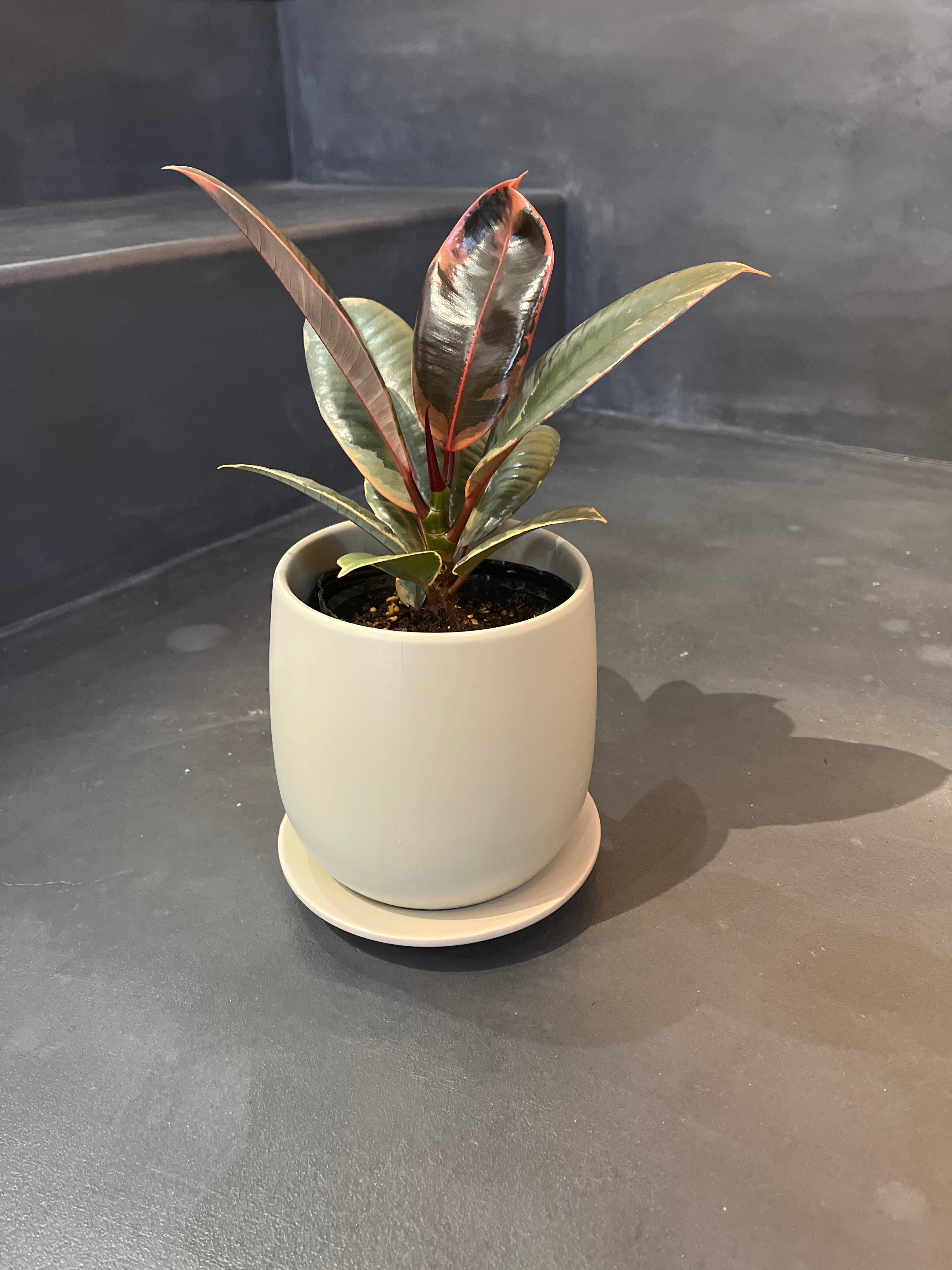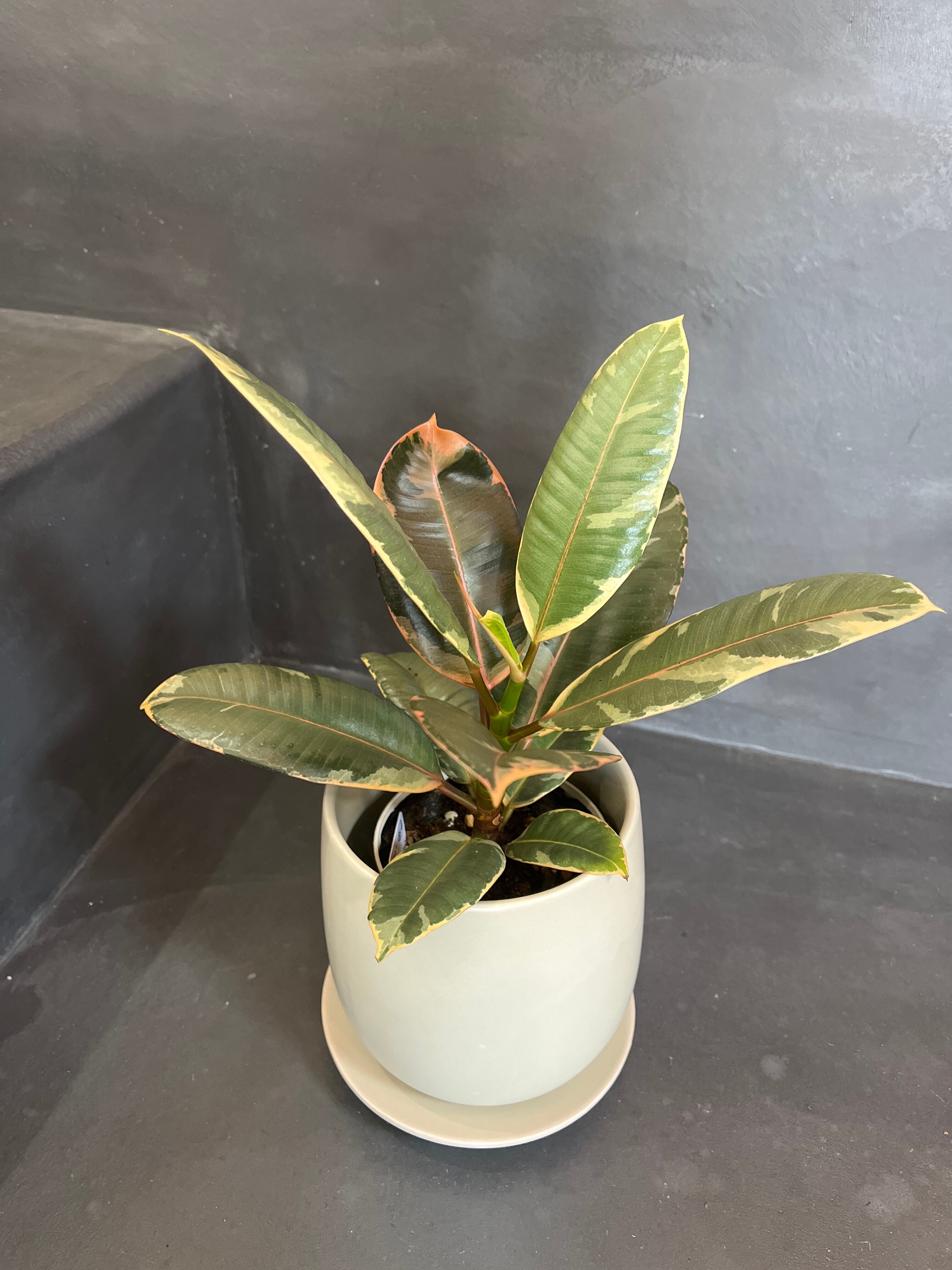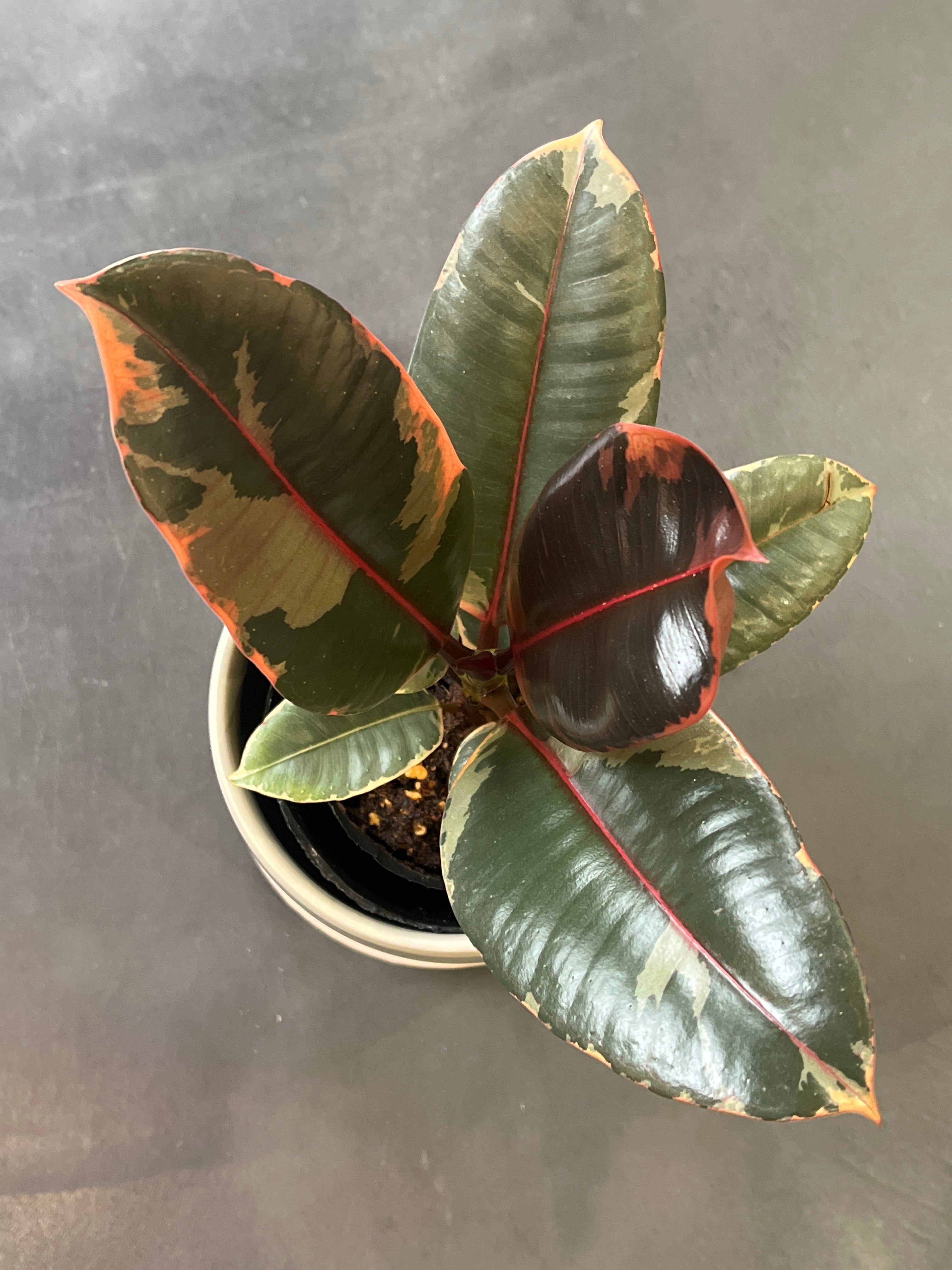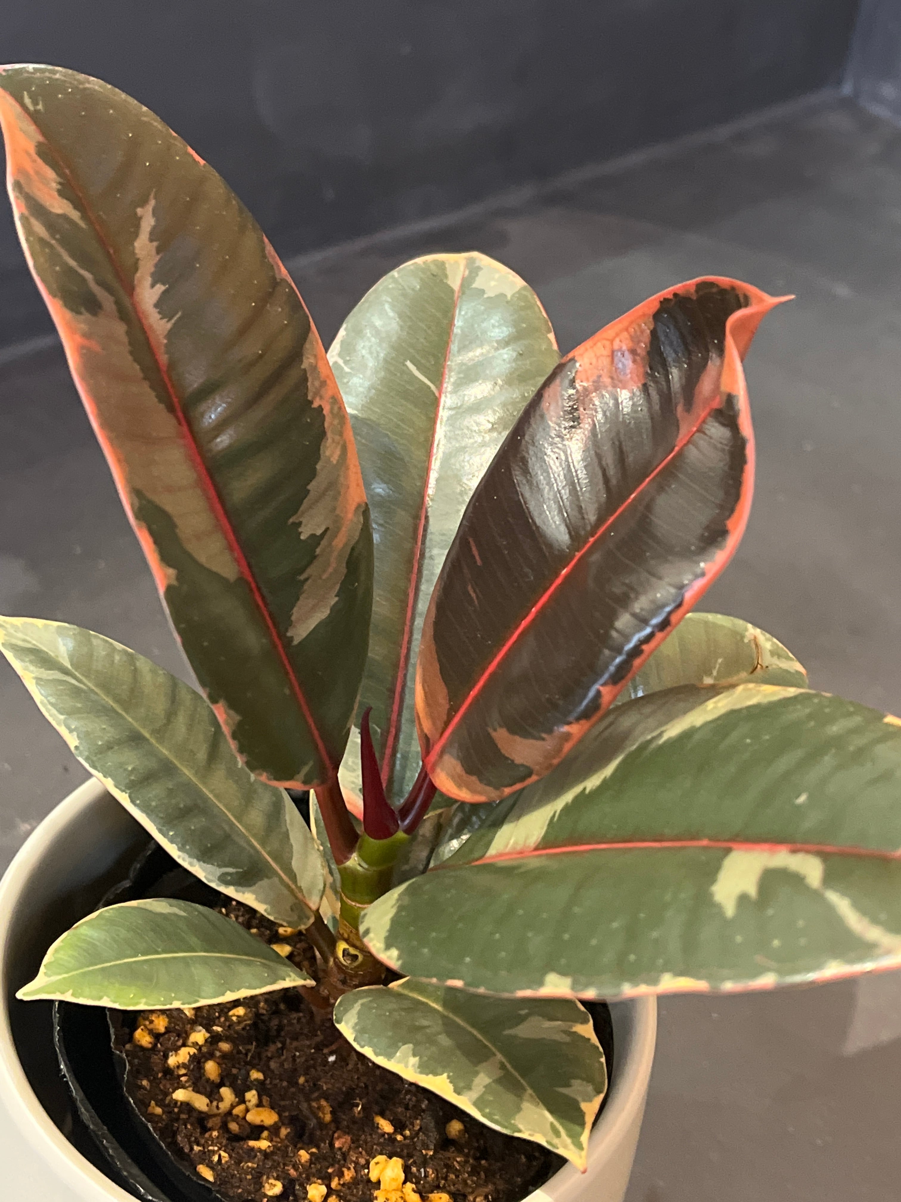 フィカス ルビーは、黄緑色の葉に赤ピンクの班が特徴的な観葉植物です。ゴムの木の仲間なので「赤ゴム」と呼ばれることも。