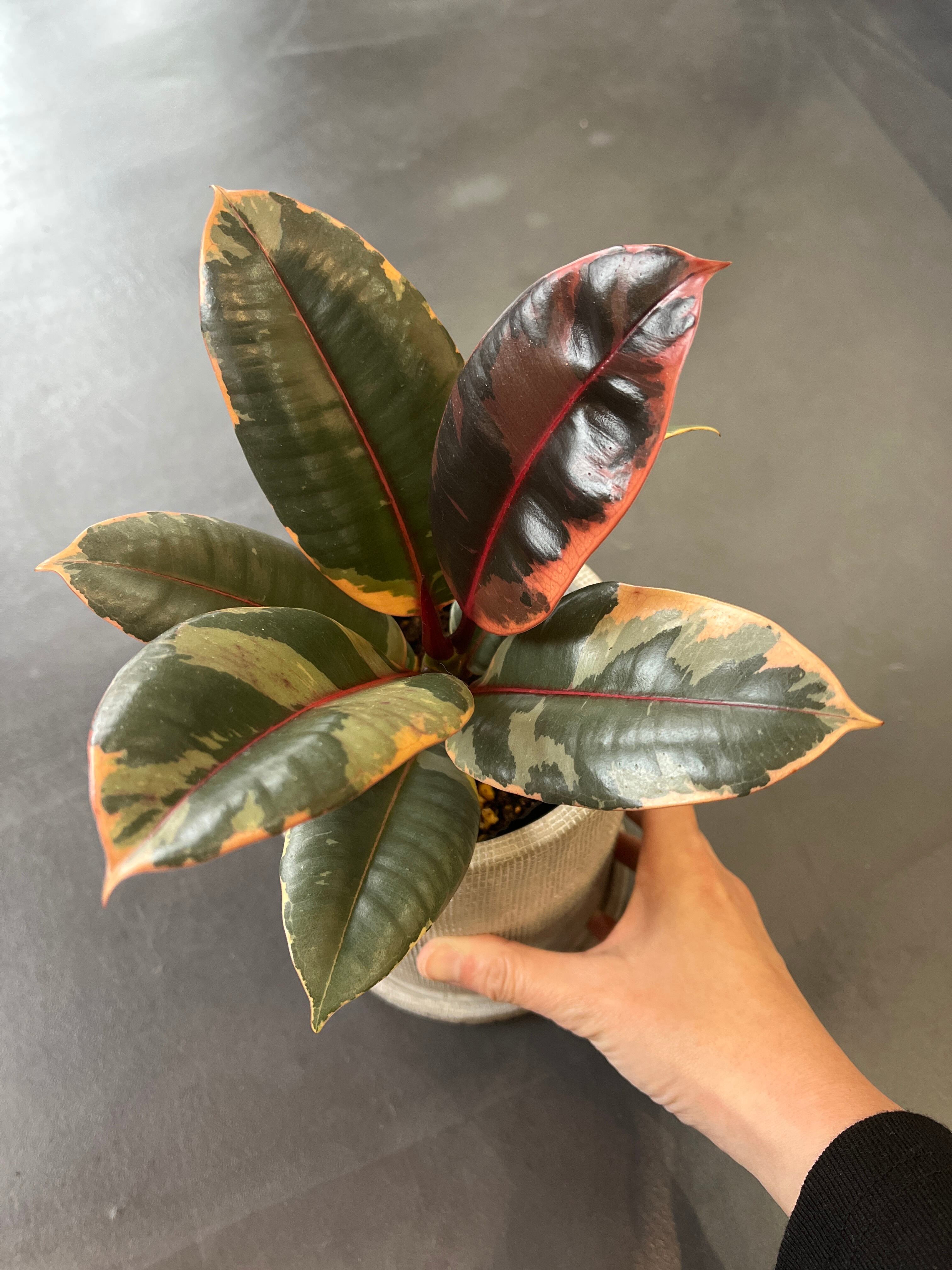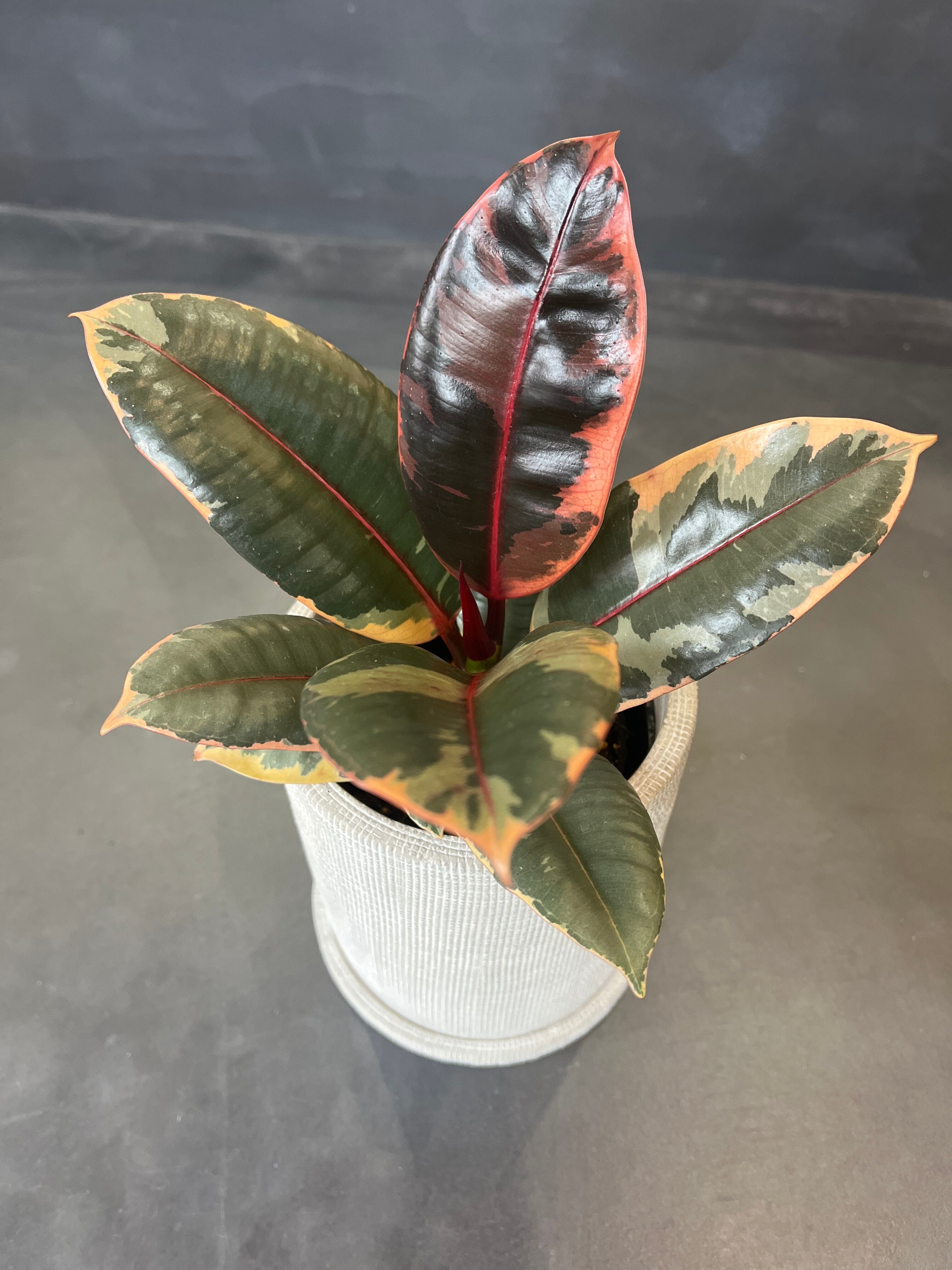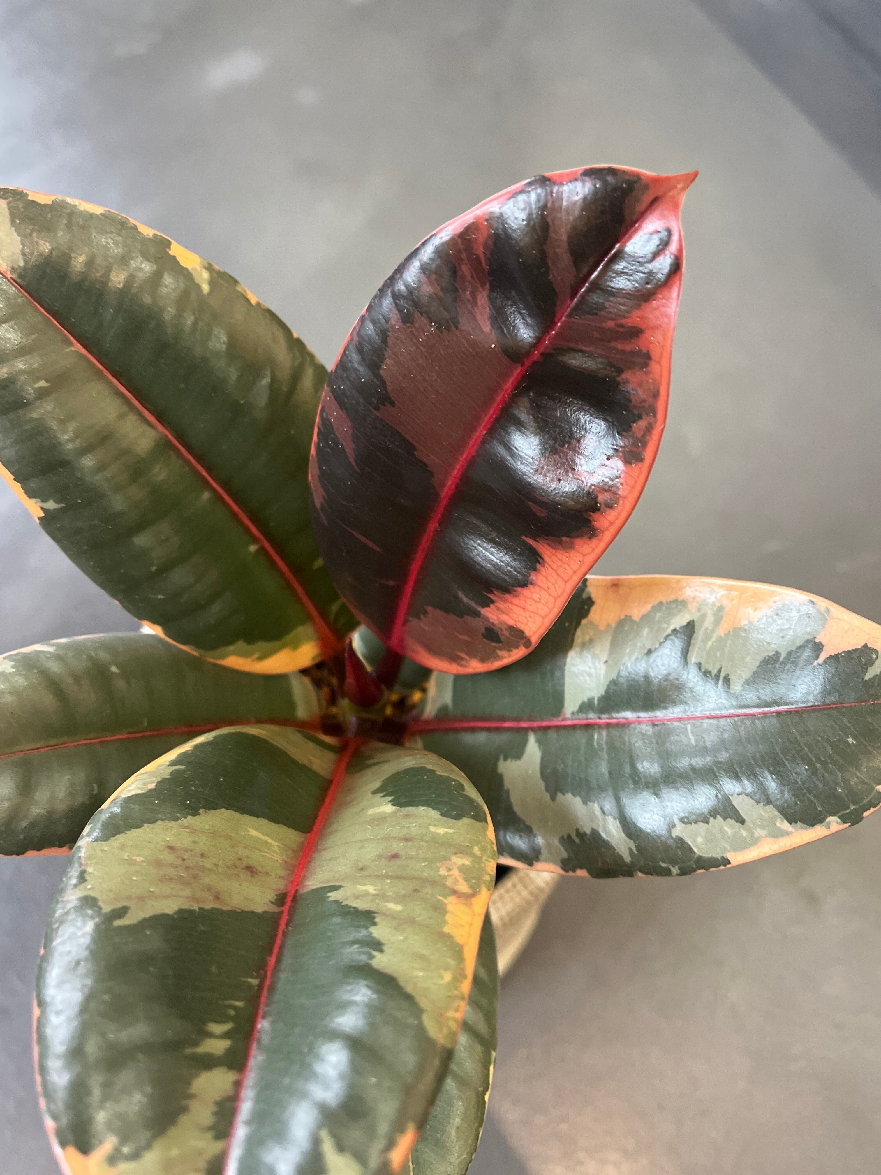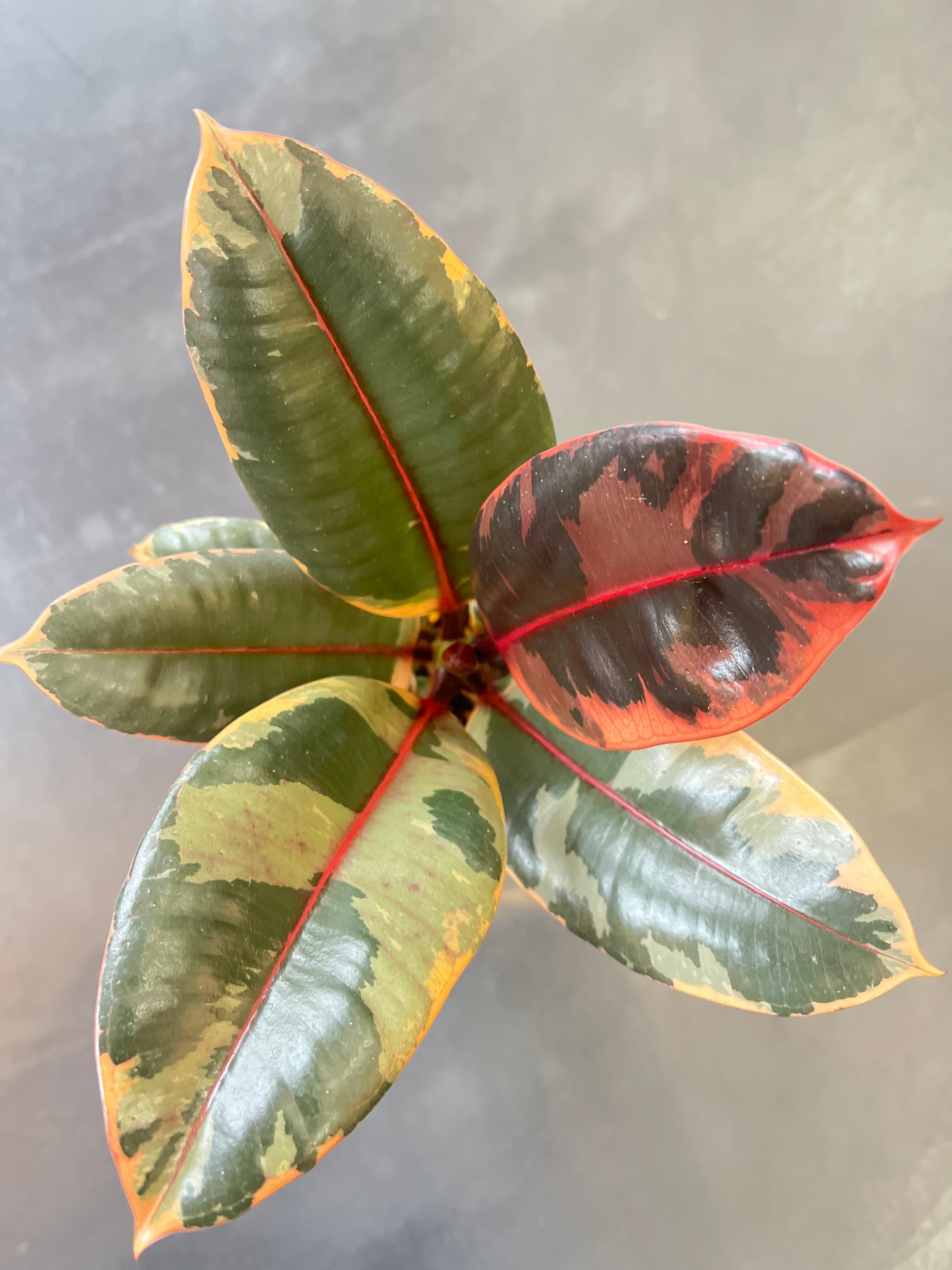 フィカス ルビーは、黄緑色の葉に赤ピンクの班が特徴的な観葉植物です。ゴムの木の仲間なので「赤ゴム」と呼ばれることも。