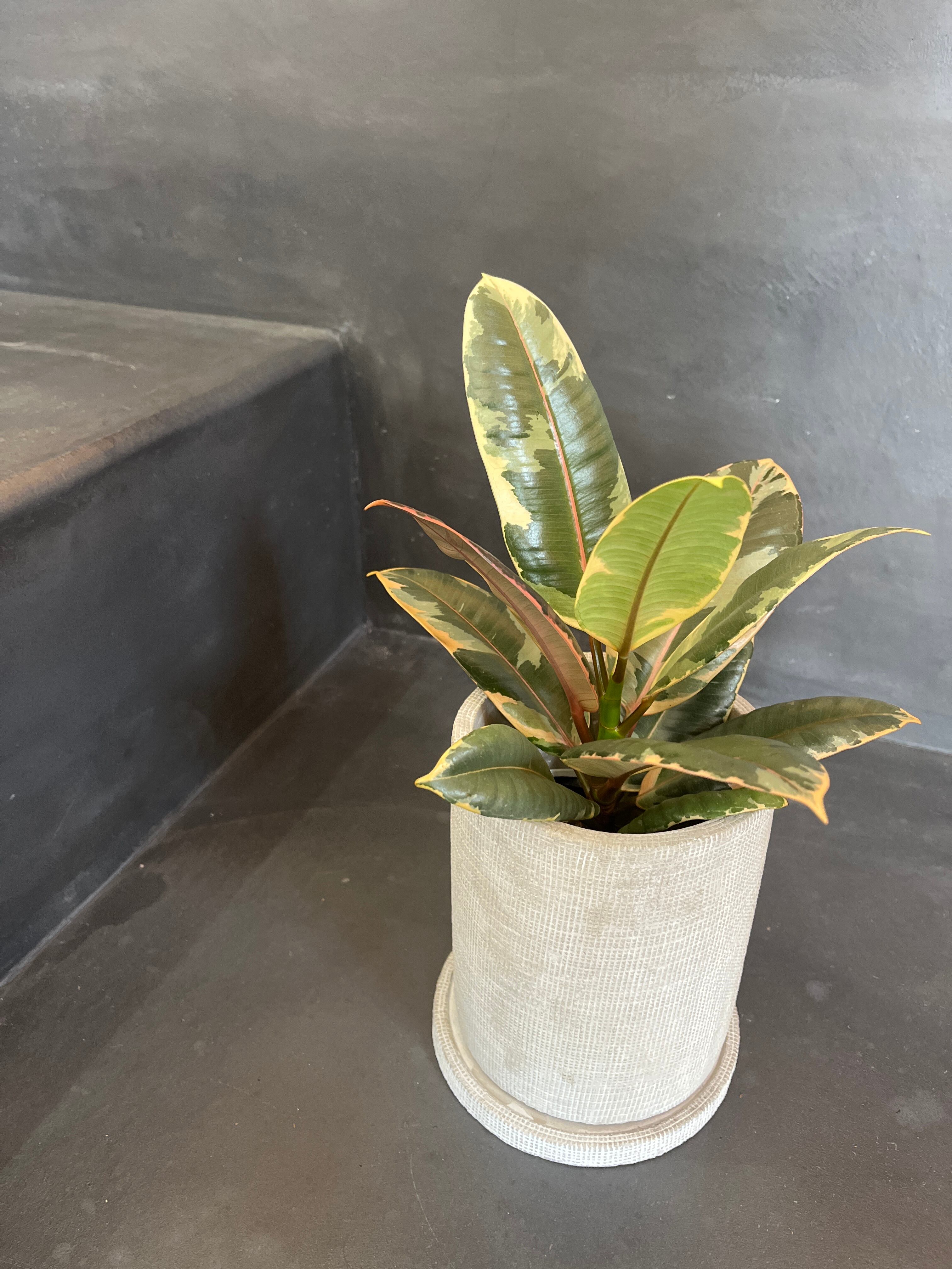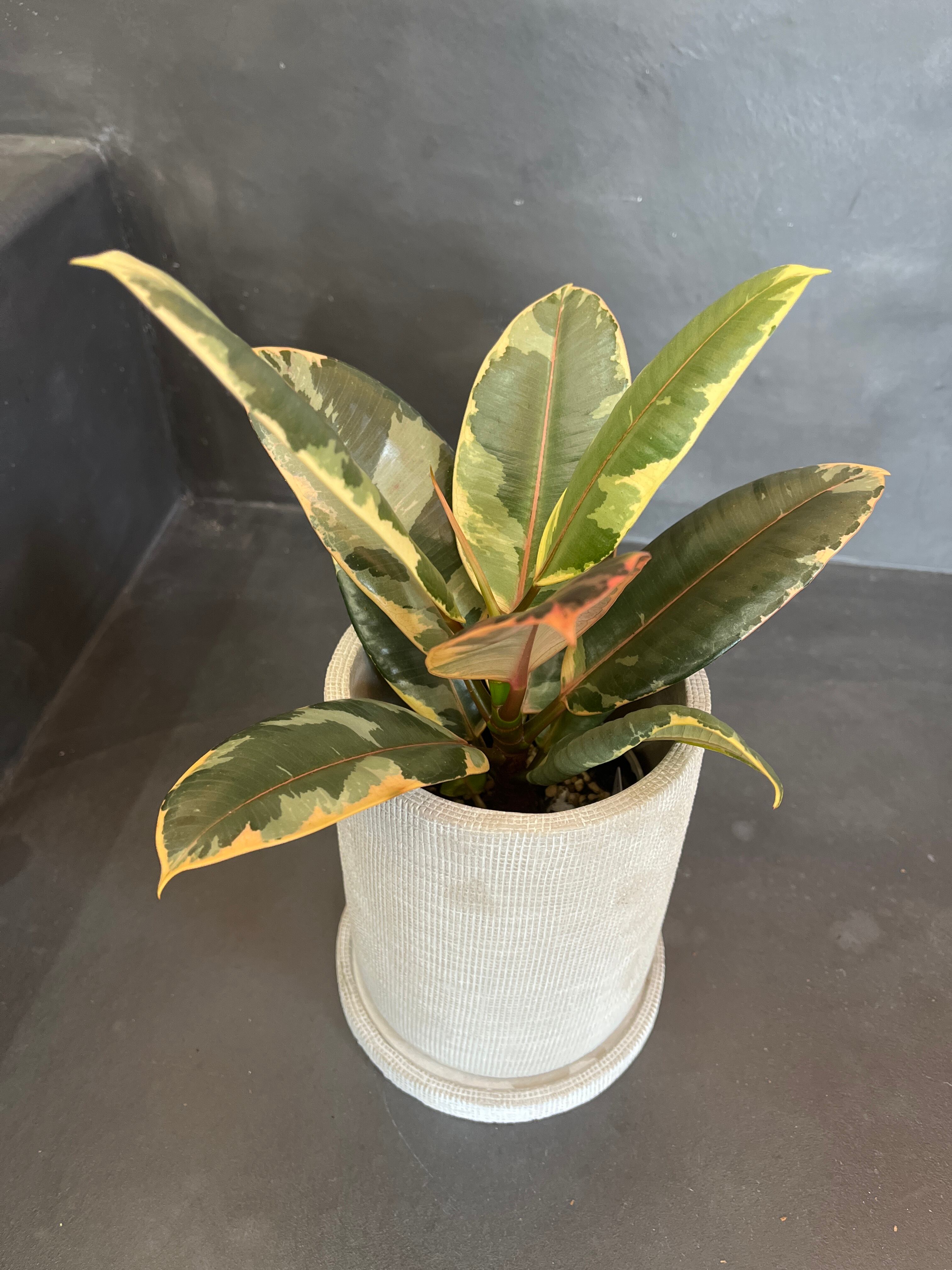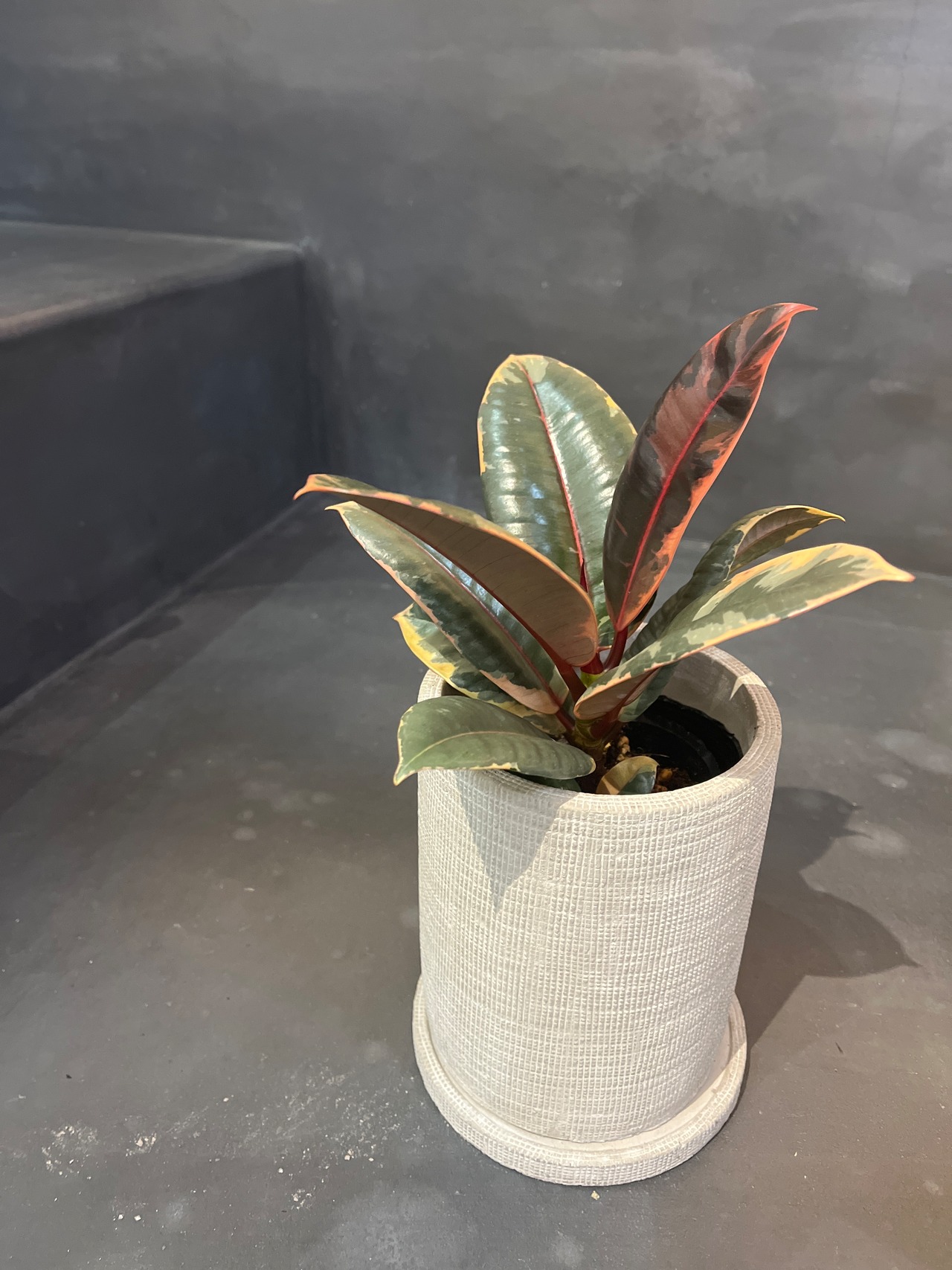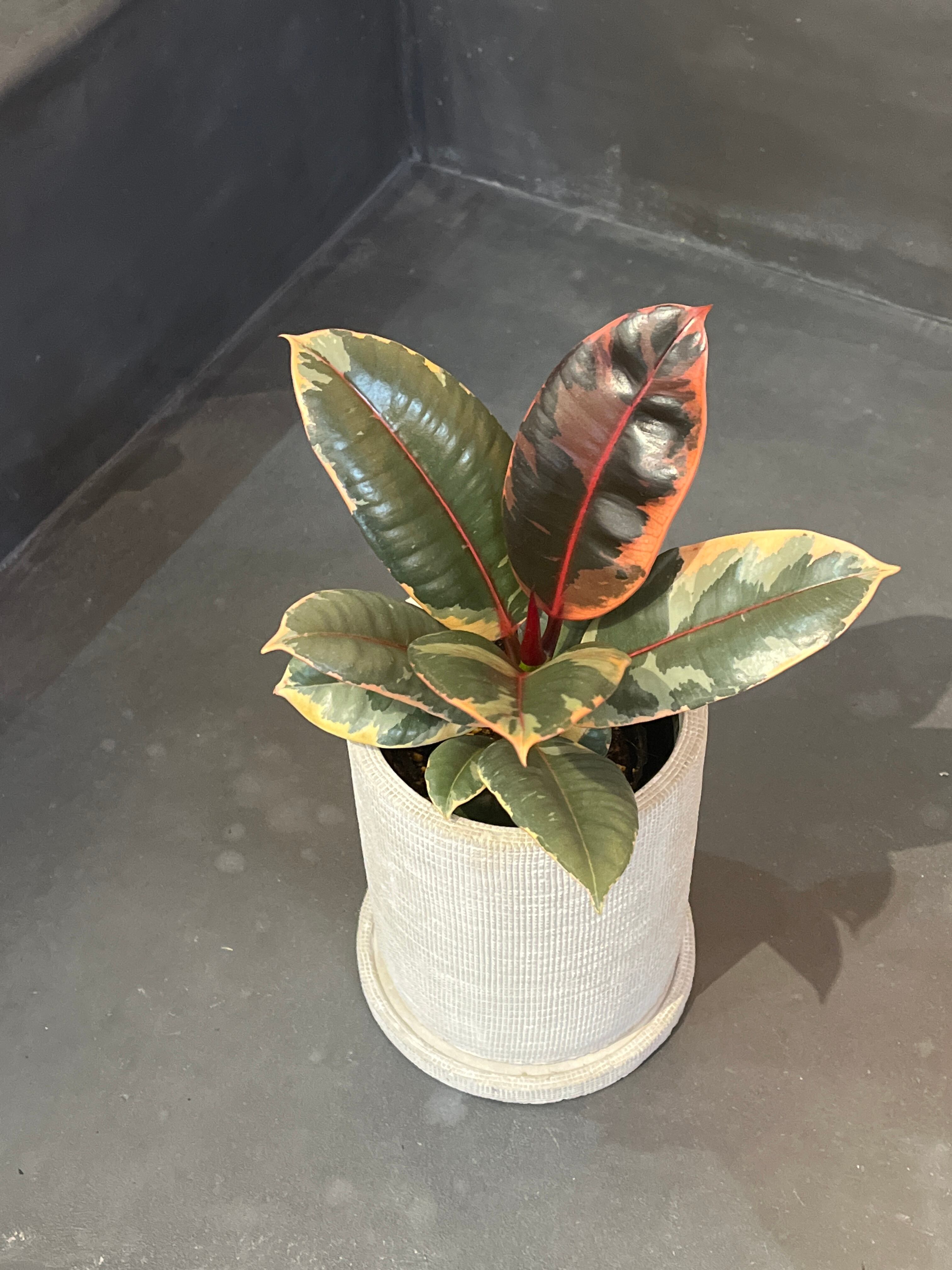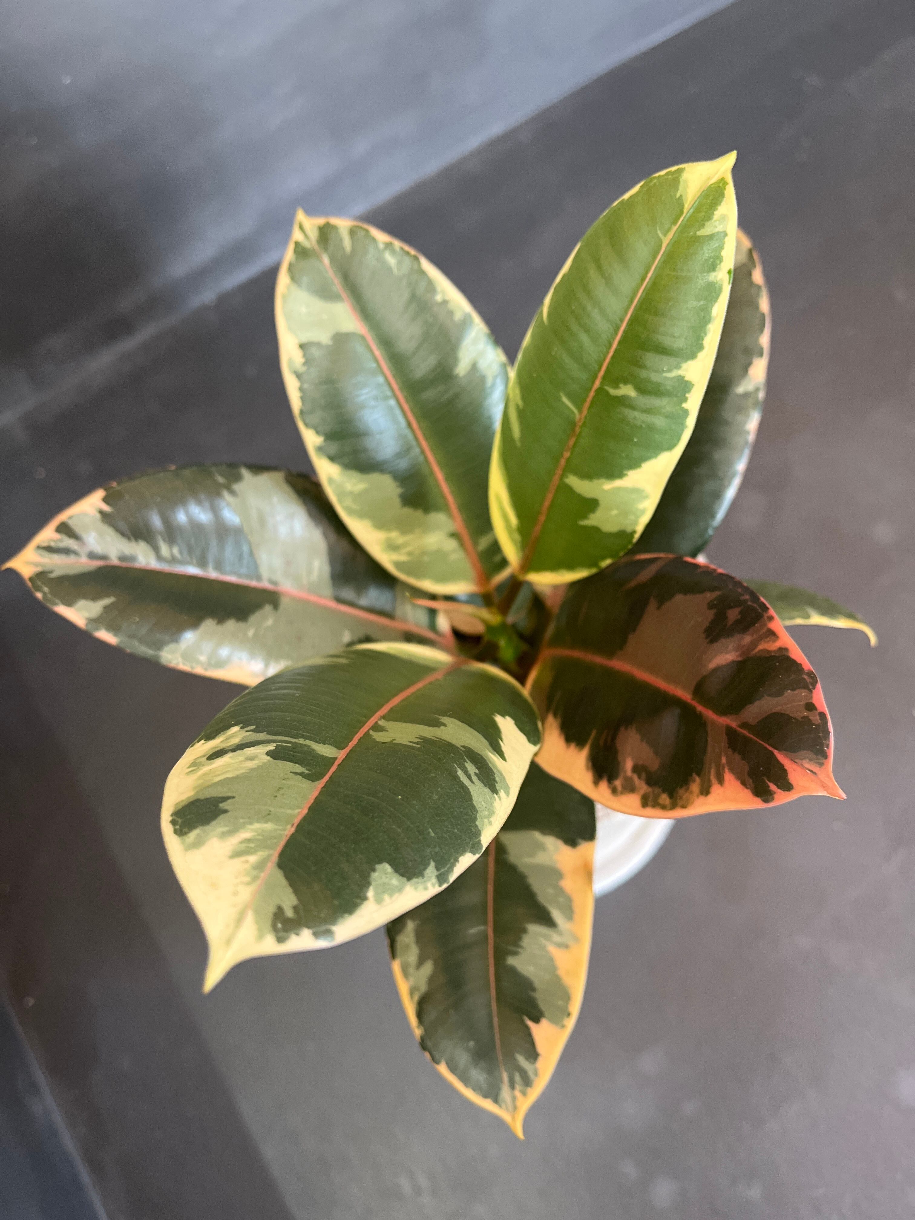 フィカス ルビーは、黄緑色の葉に赤ピンクの班が特徴的な観葉植物です。ゴムの木の仲間なので「赤ゴム」と呼ばれることも。
