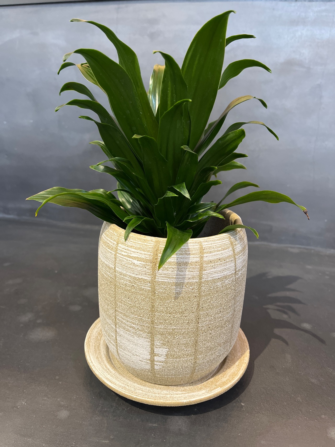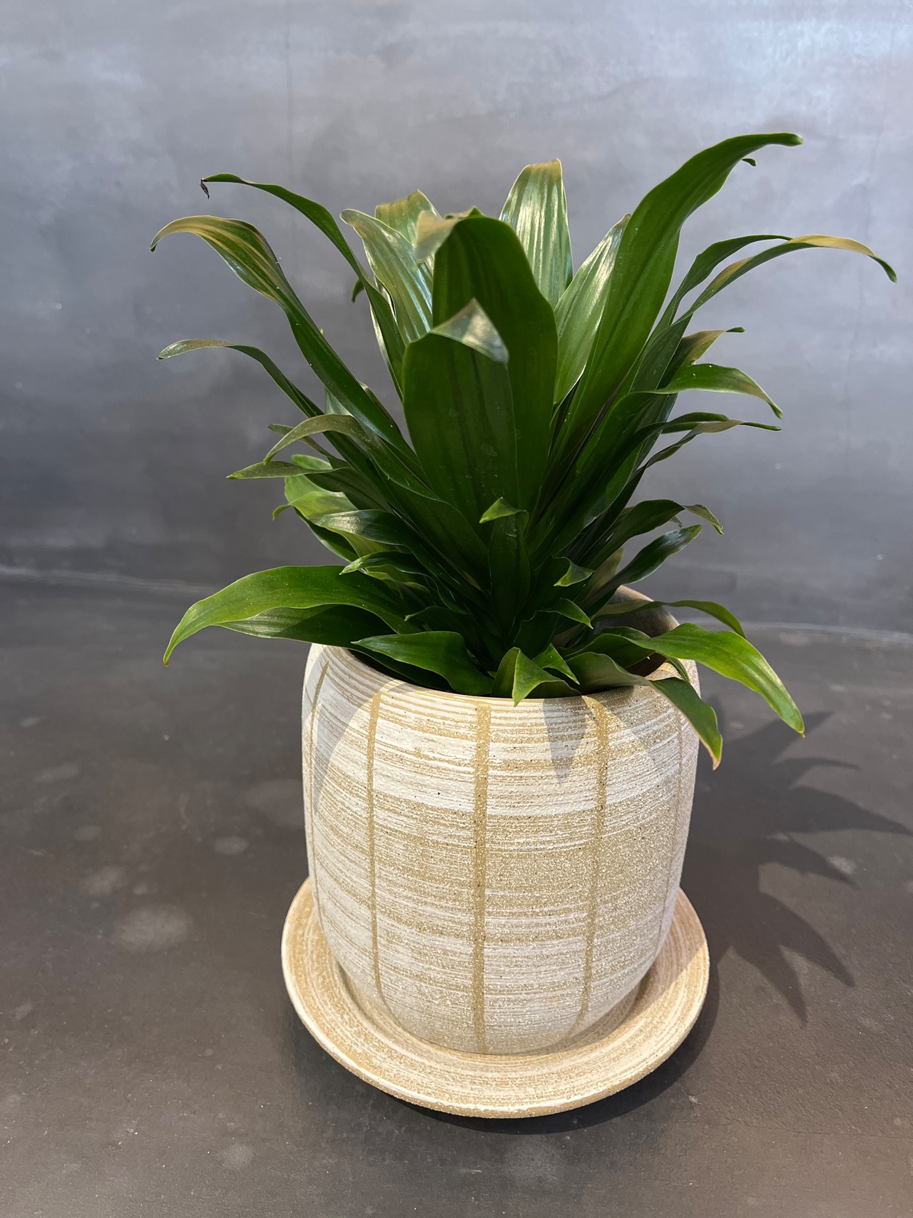 落ち着いたデザインの鉢なので、大人な遊び心のあるひと鉢になりました。