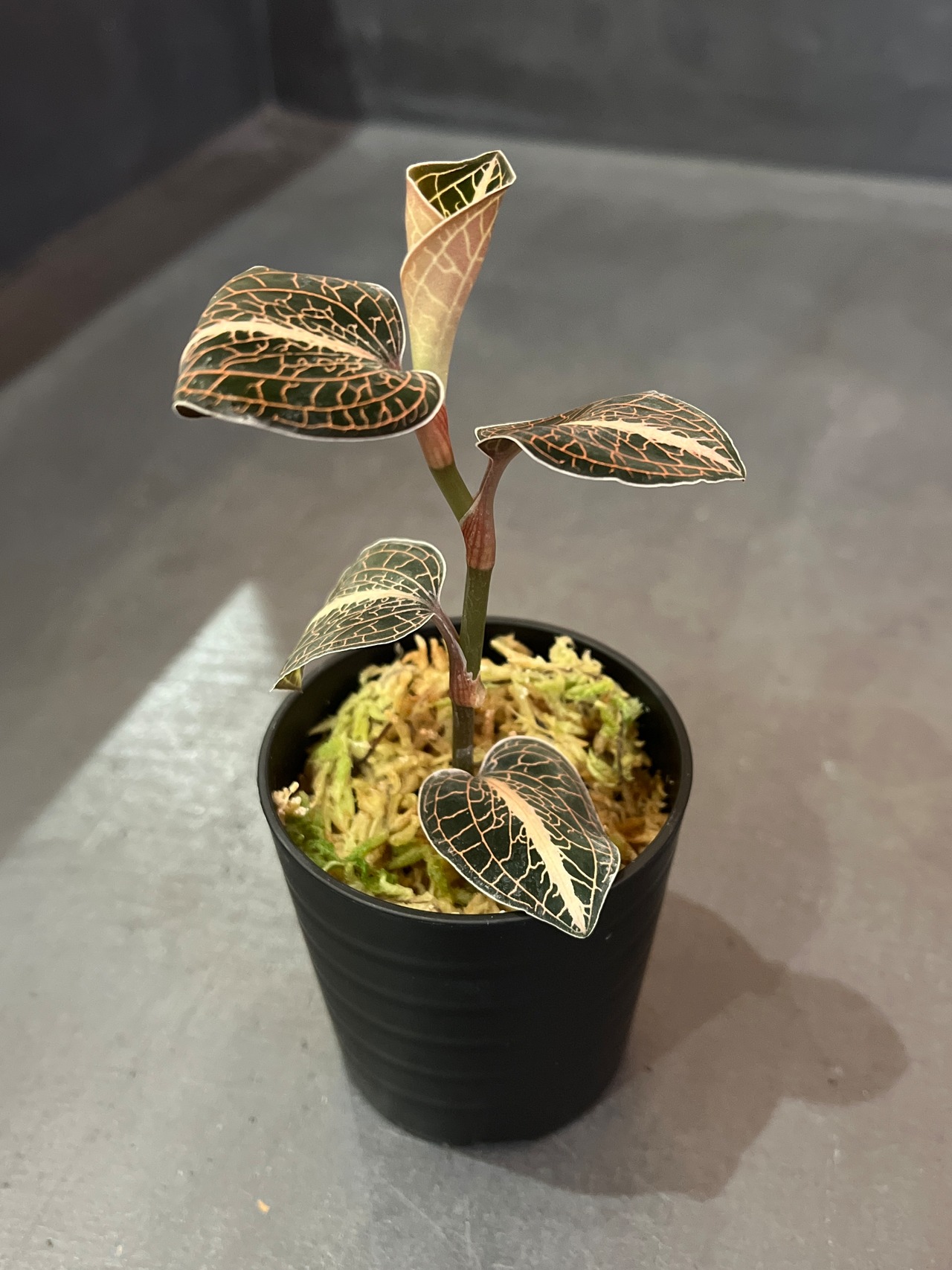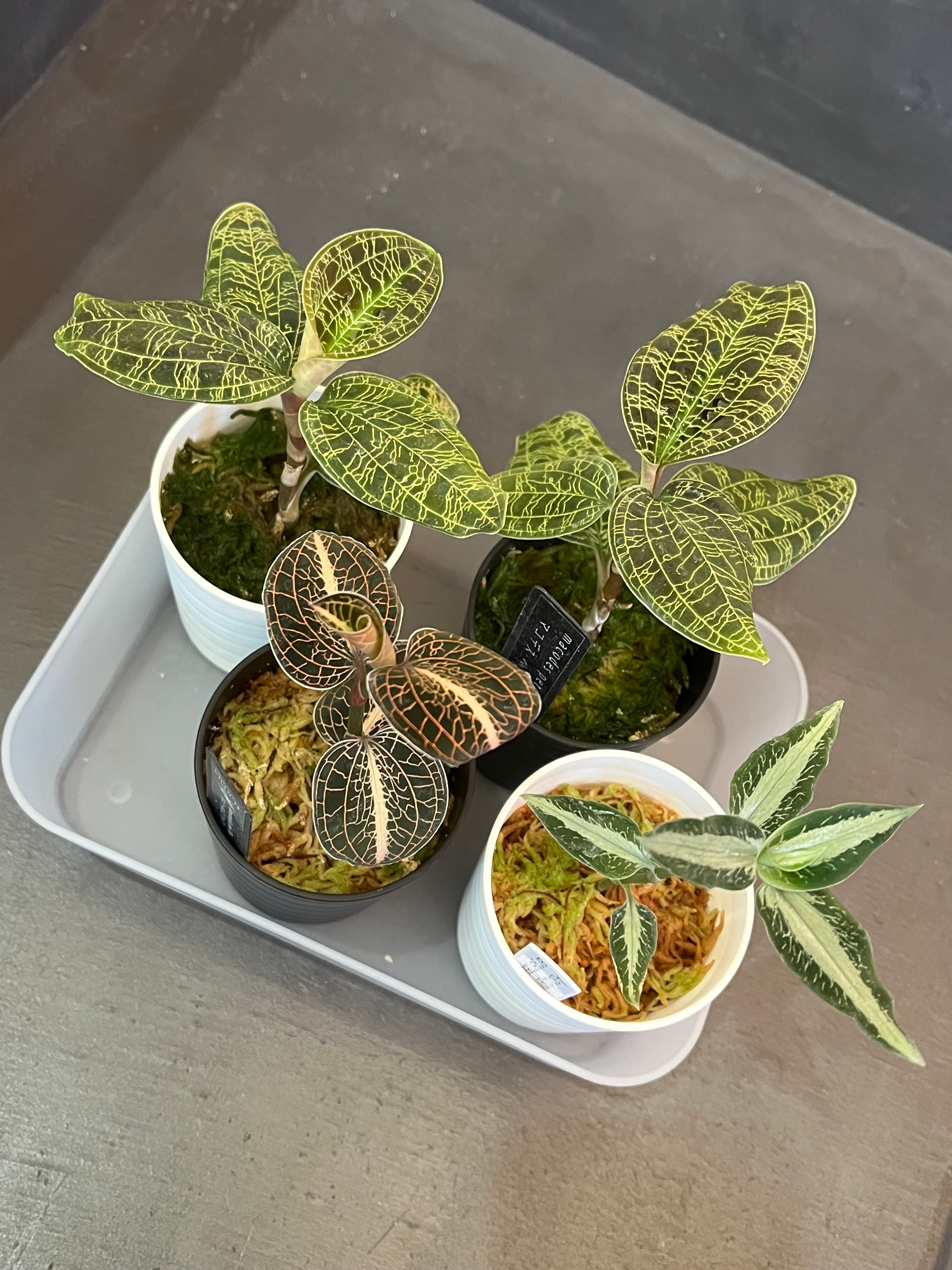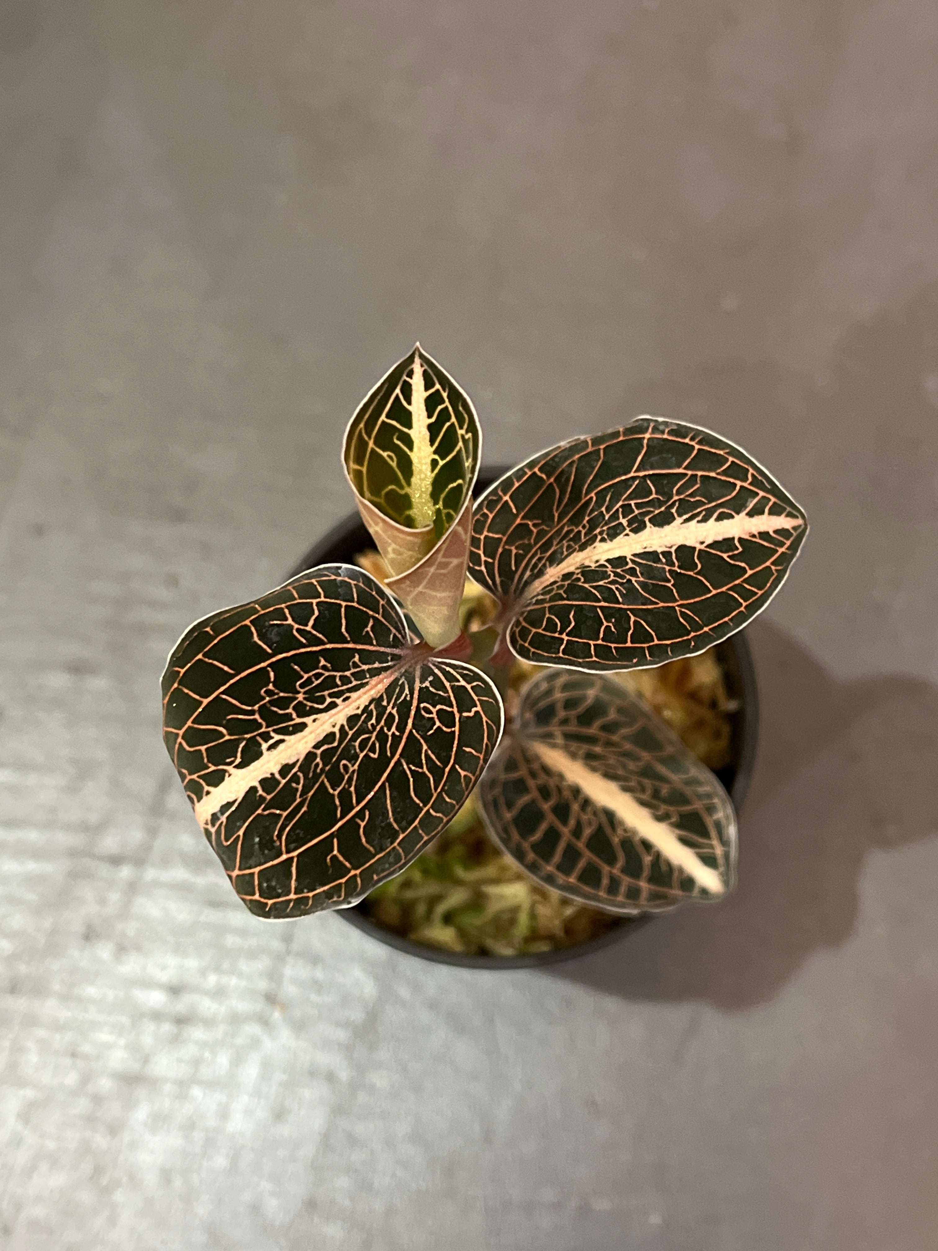 「宝石蘭」ジュエルオーキッドと呼ばれているビロード状の葉に光り輝く葉脈が美しい不思議な蘭です。
