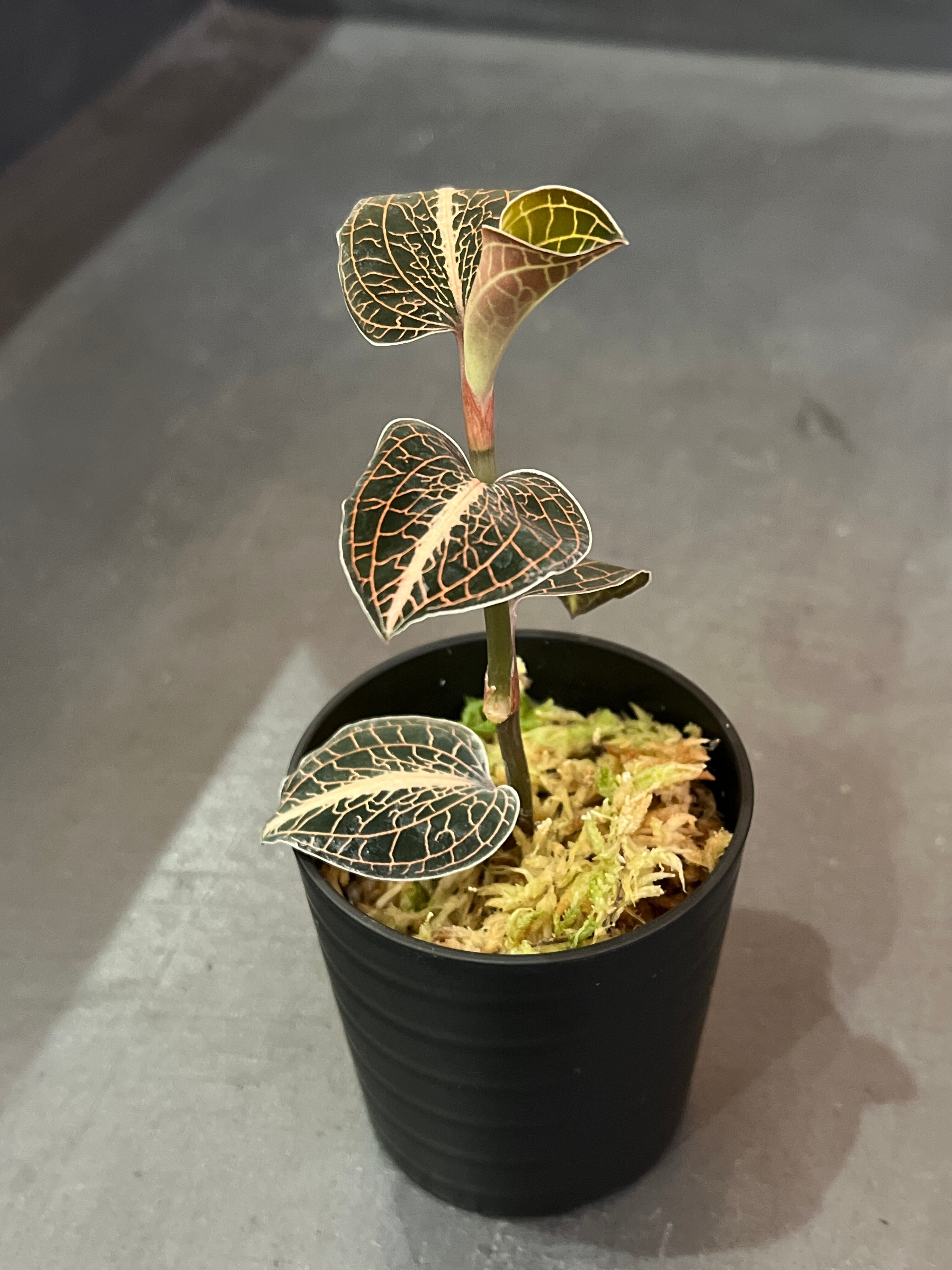 アネクトキルスリレイローズは深い緑色の葉に黄色やオレンジに近い赤の葉脈、中央に太い白いライン、葉が丸まる愛らしいフォルムが特徴です。