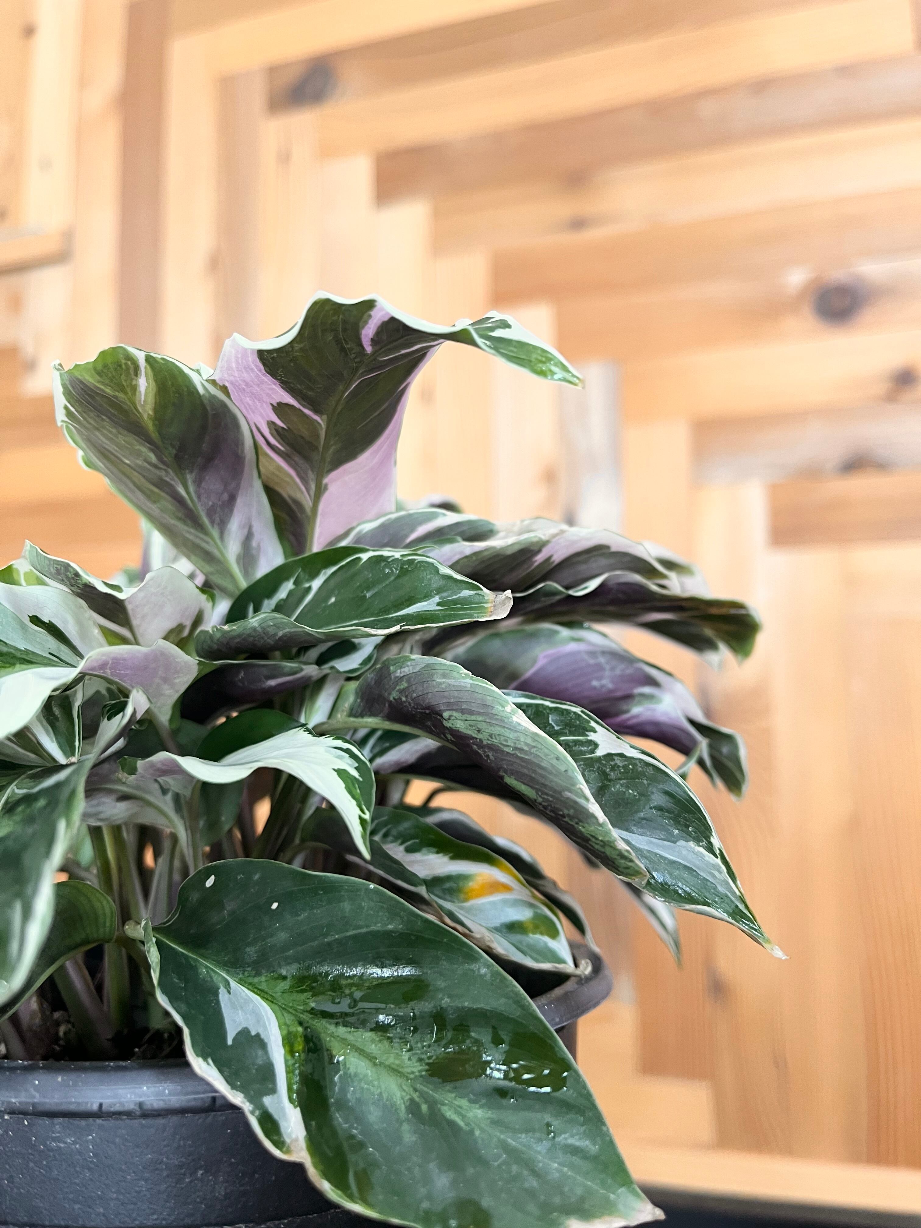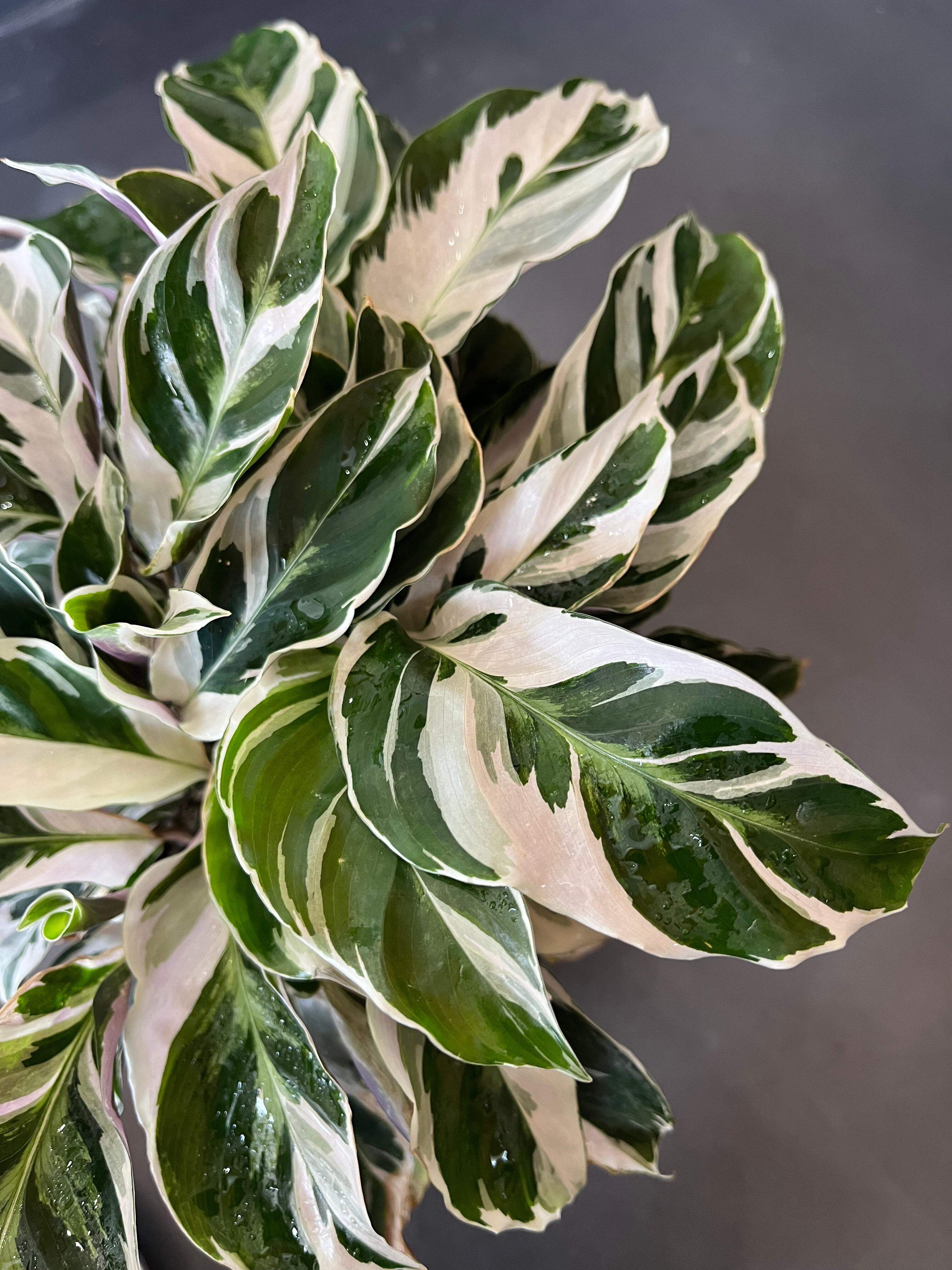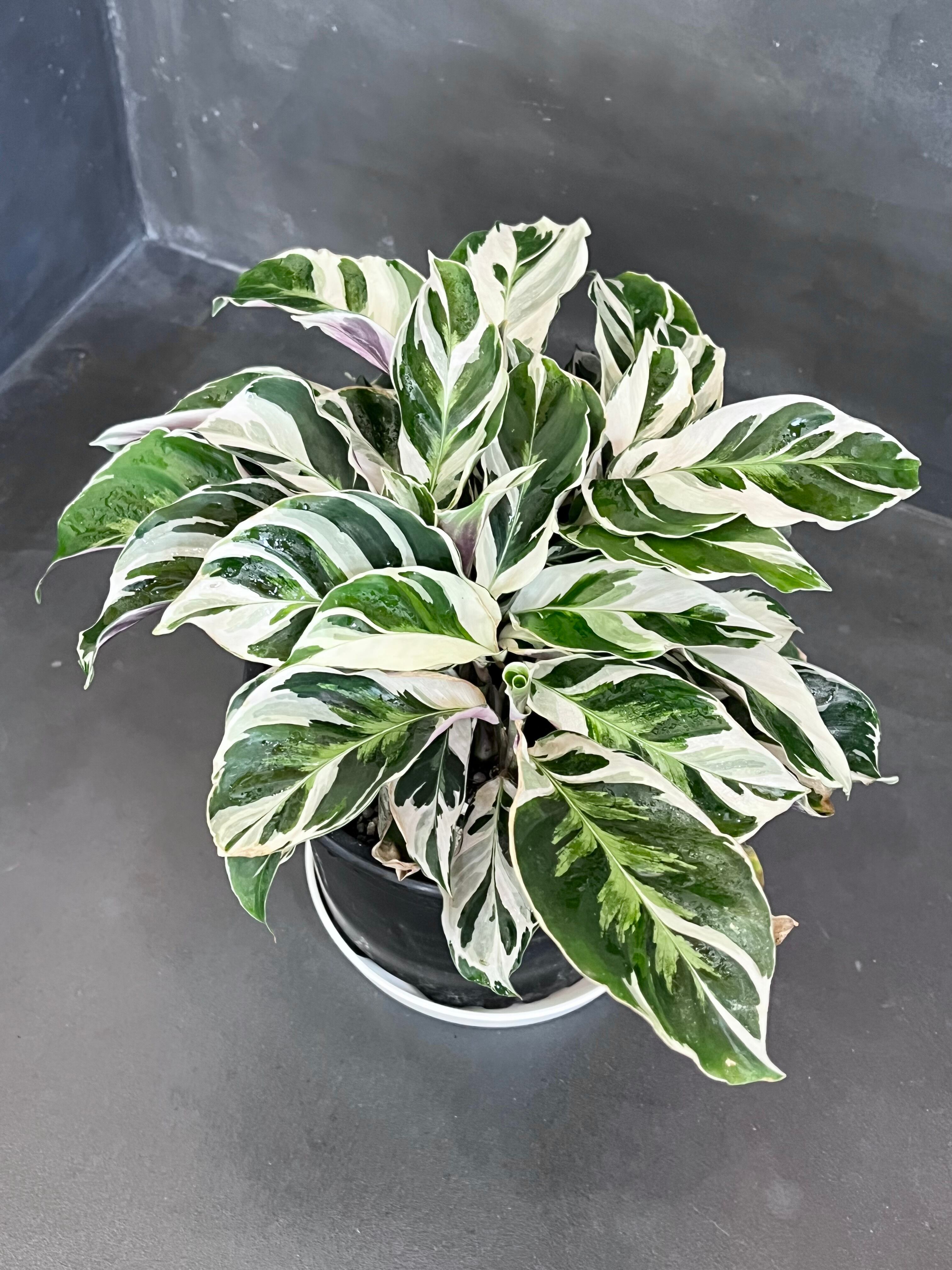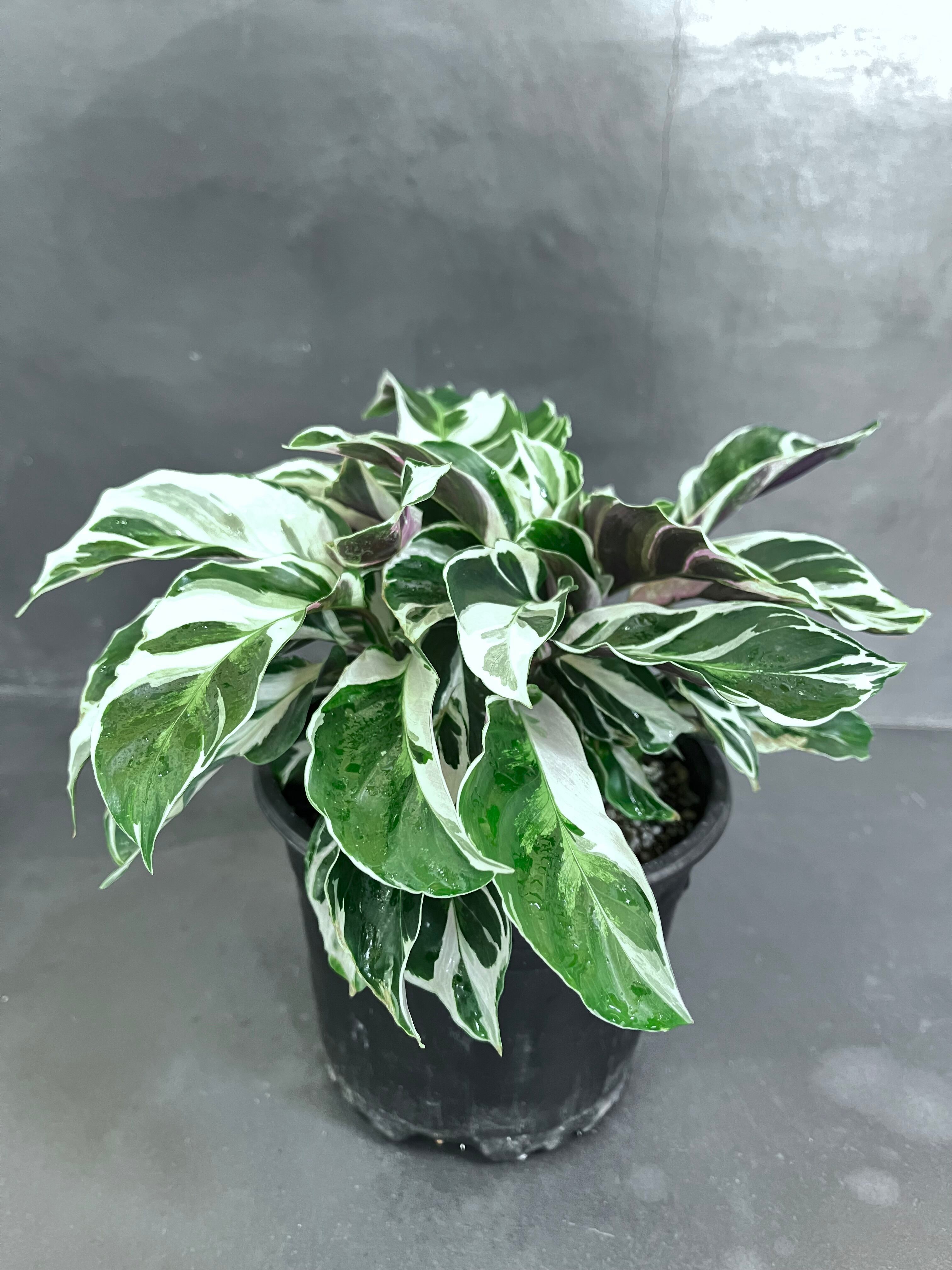 グリーンの葉に真っ白な斑、葉の裏はうっすら紫色というなんとも美しい上品な表情のカラテアです。