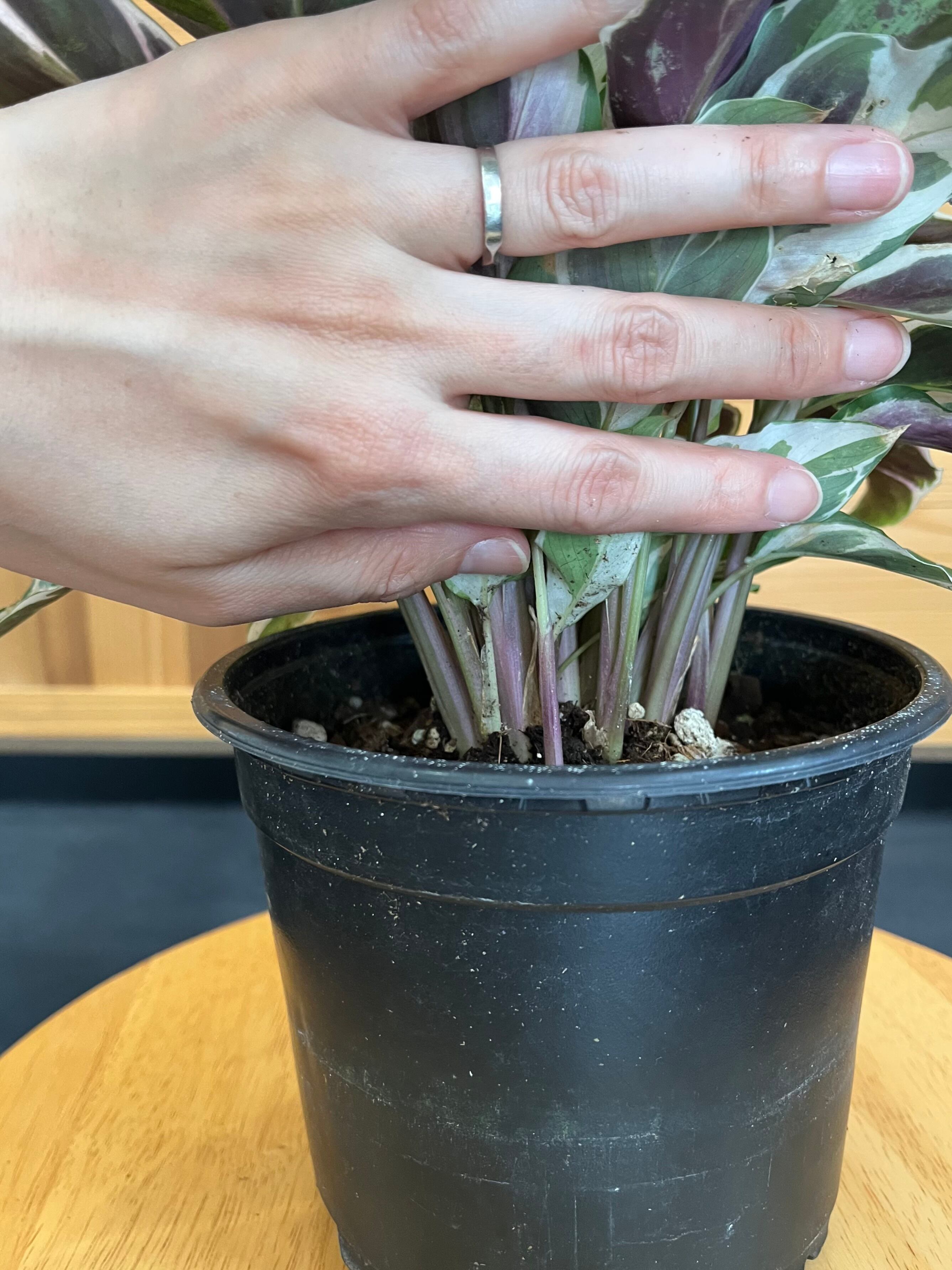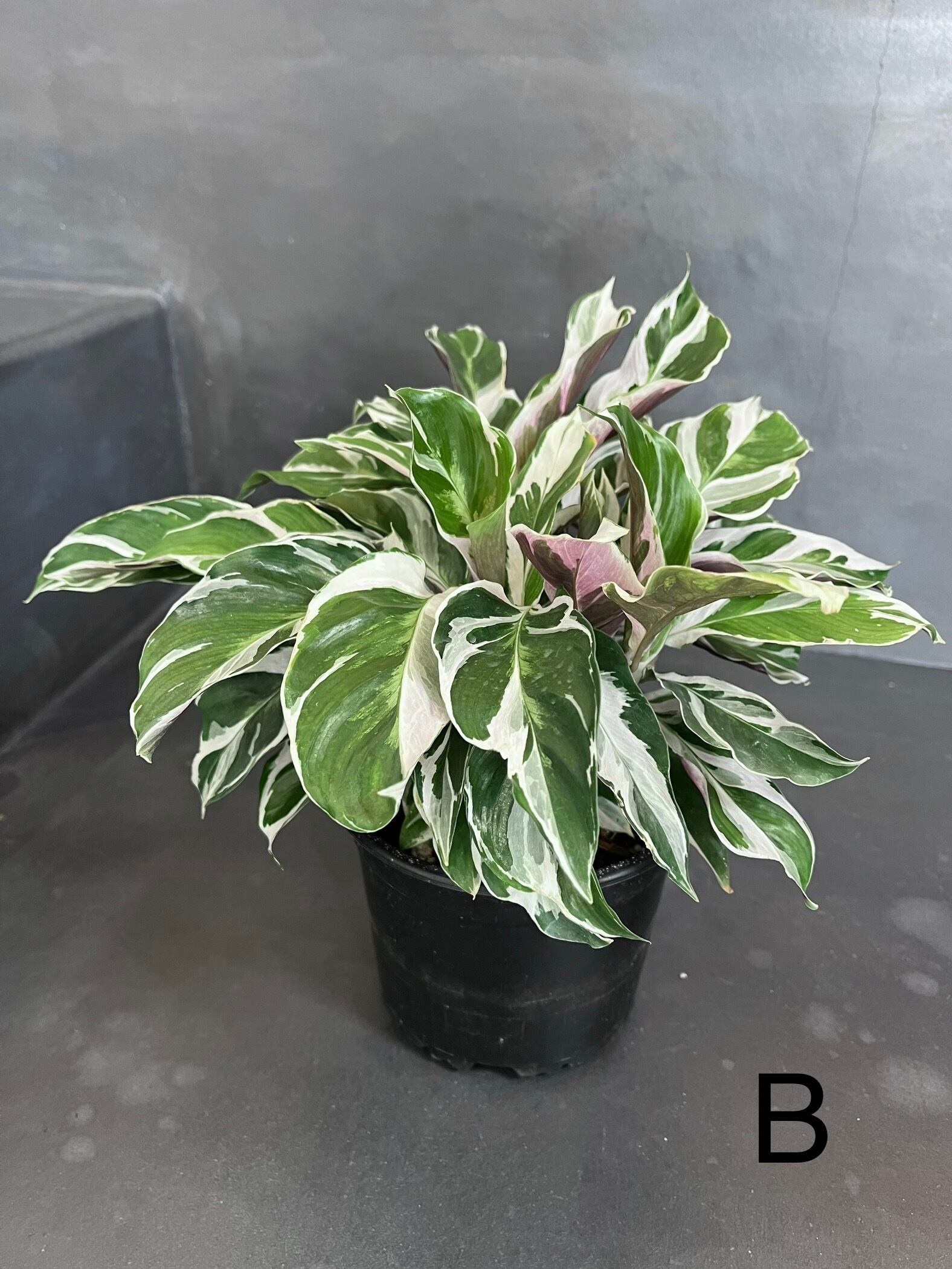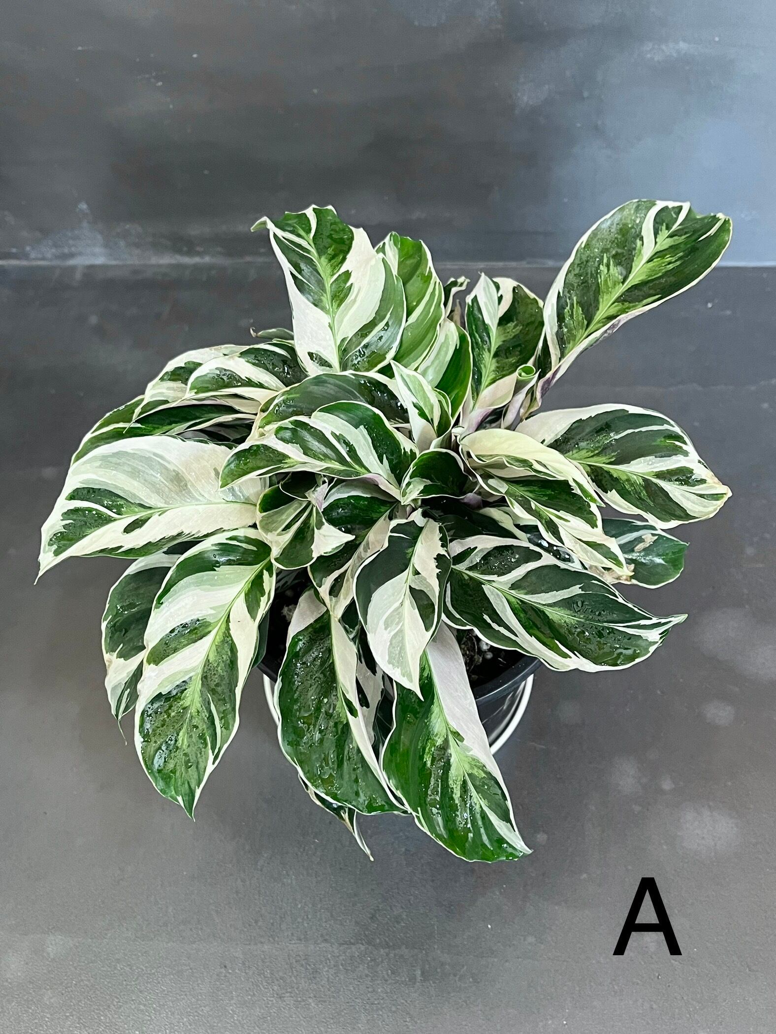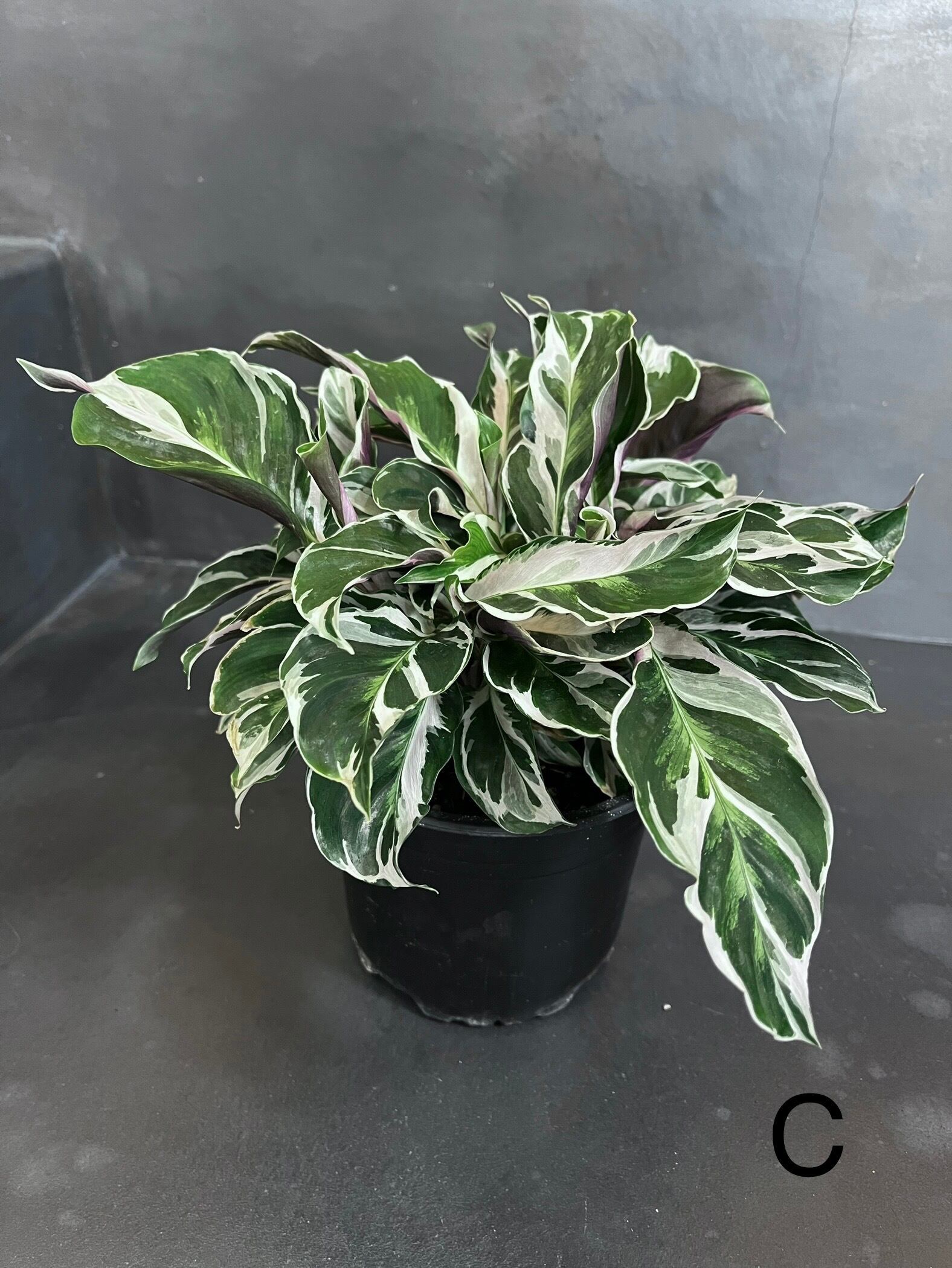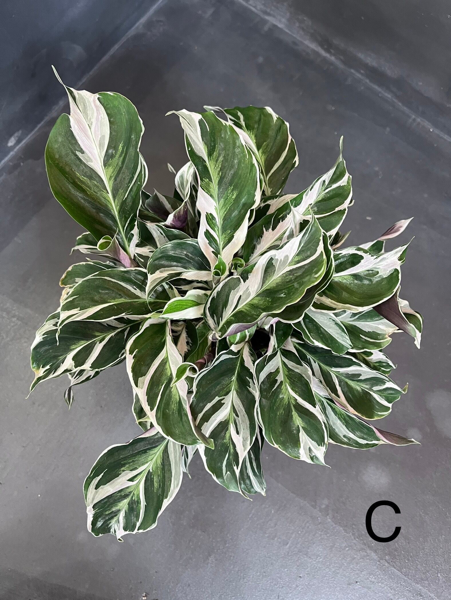 グリーンの葉に真っ白な斑、葉の裏はうっすら紫色というなんとも美しい上品な表情のカラテアです。