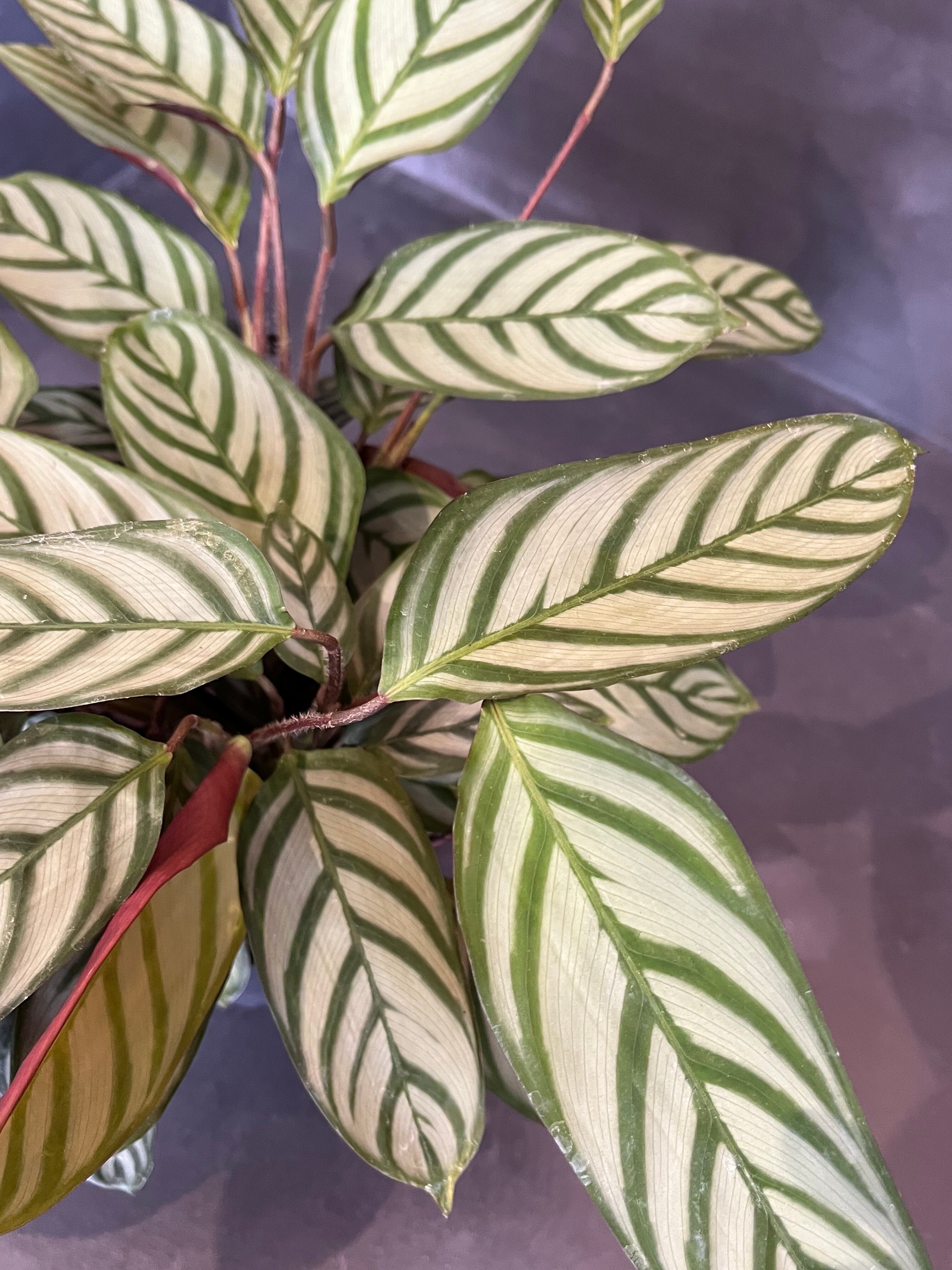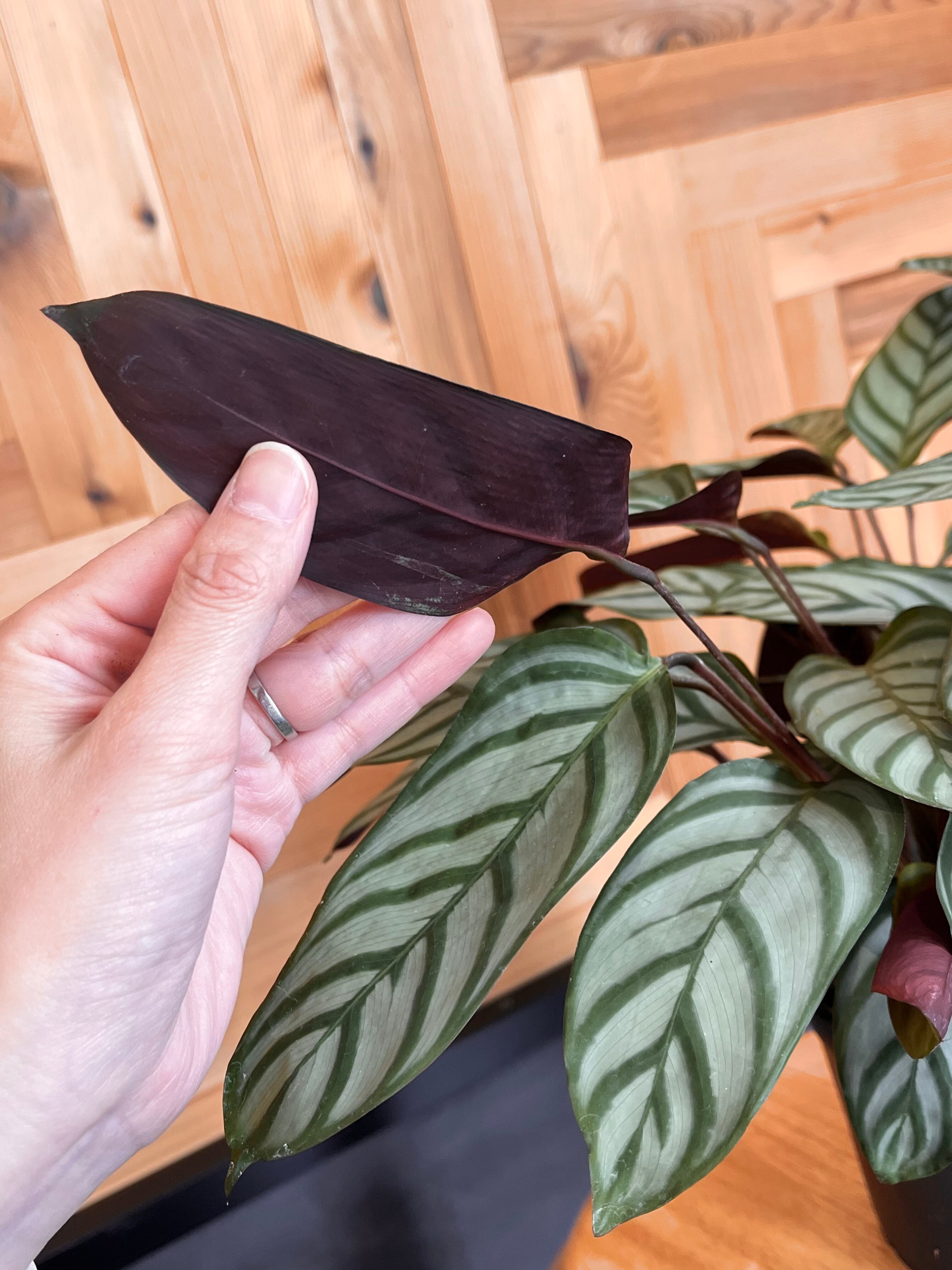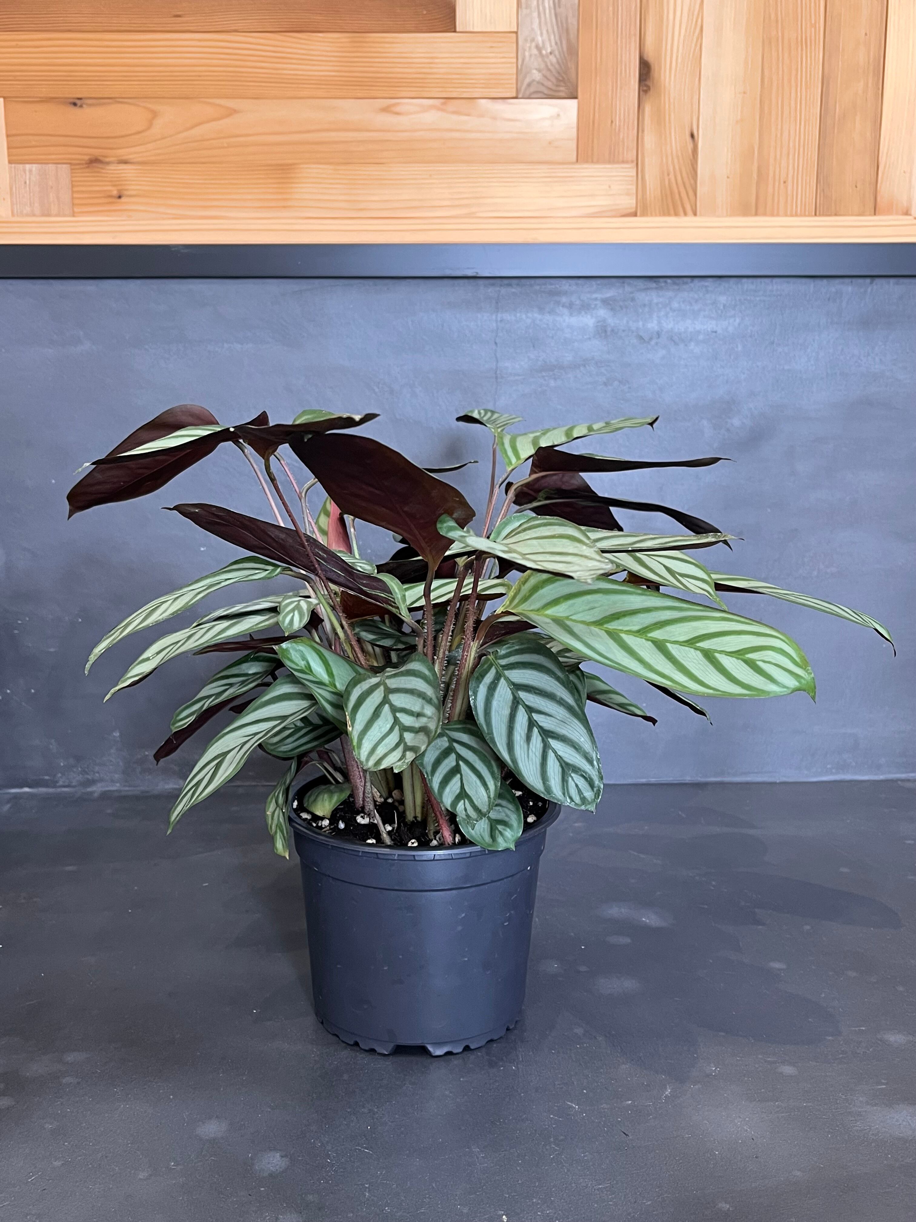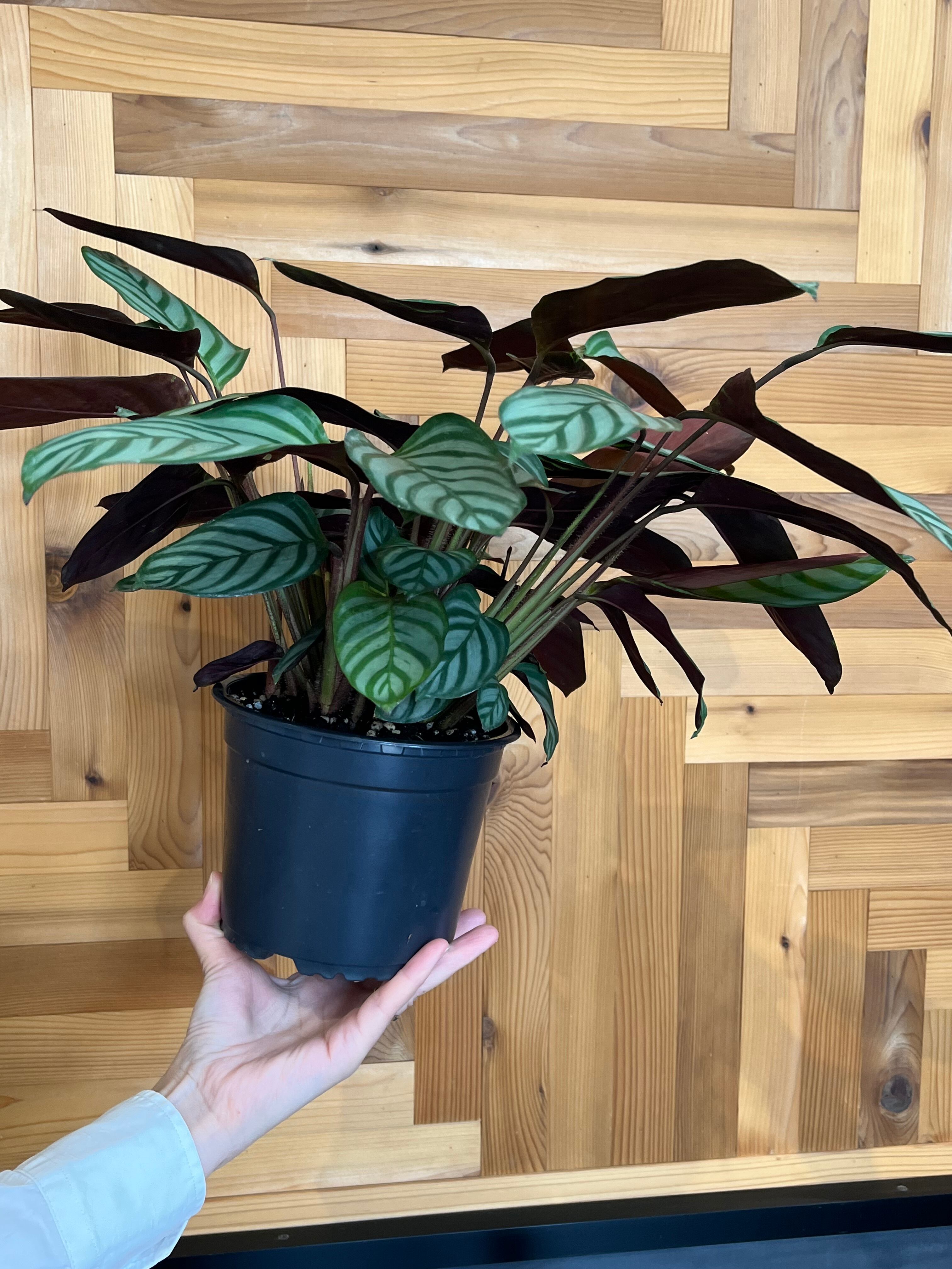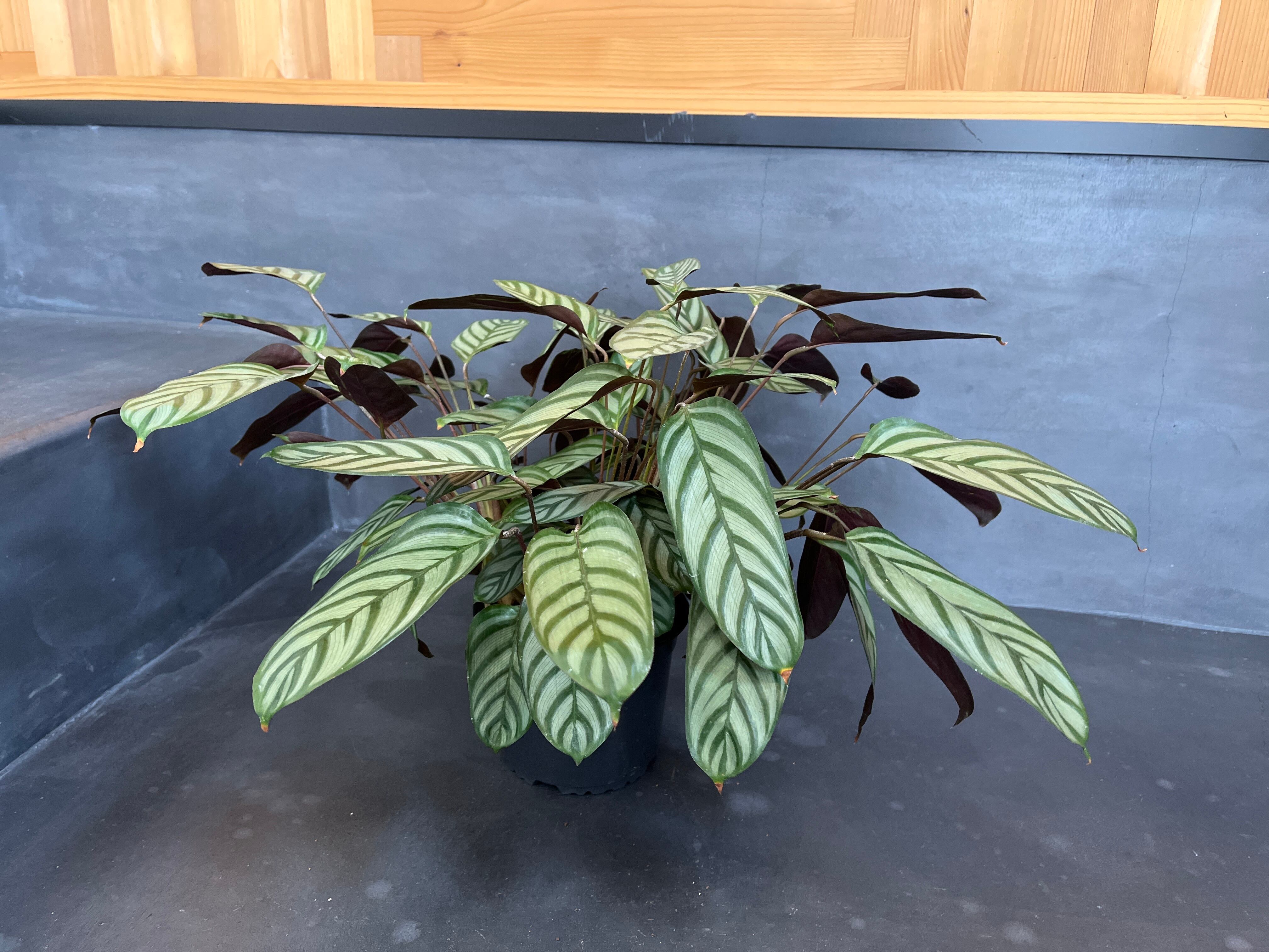 葉の裏が紫色、表面は暗緑色で、灰色の矢羽根状の斑が入る葉がきれいな種類です。