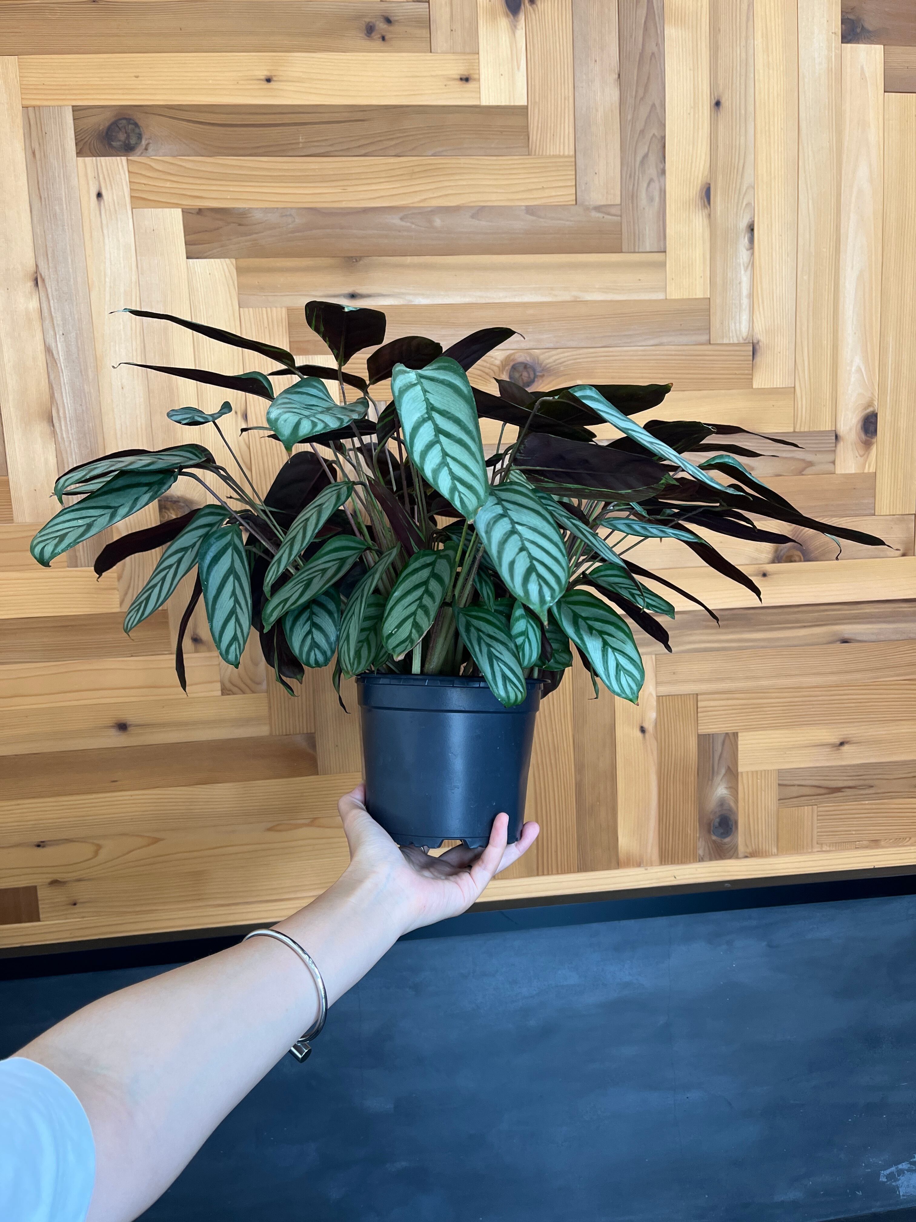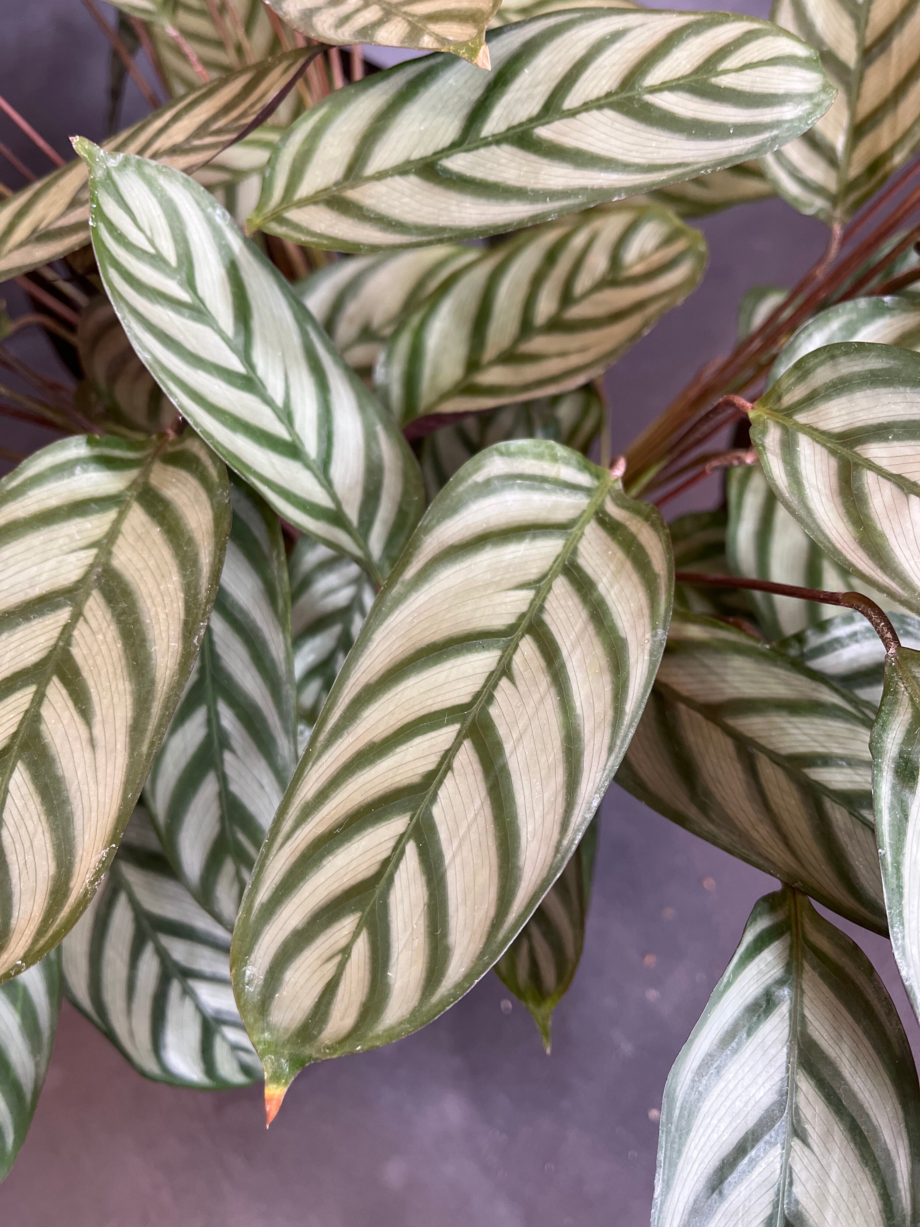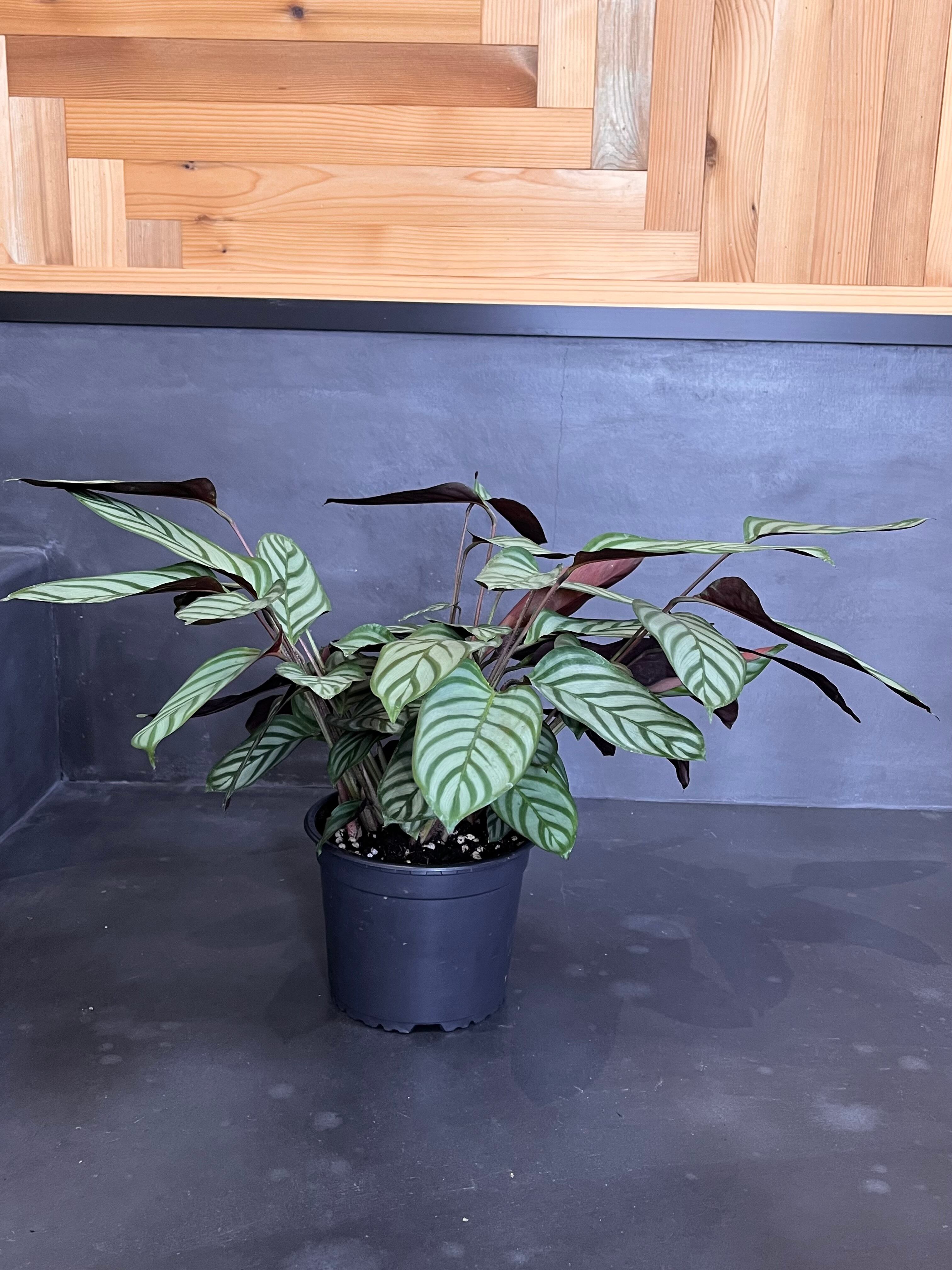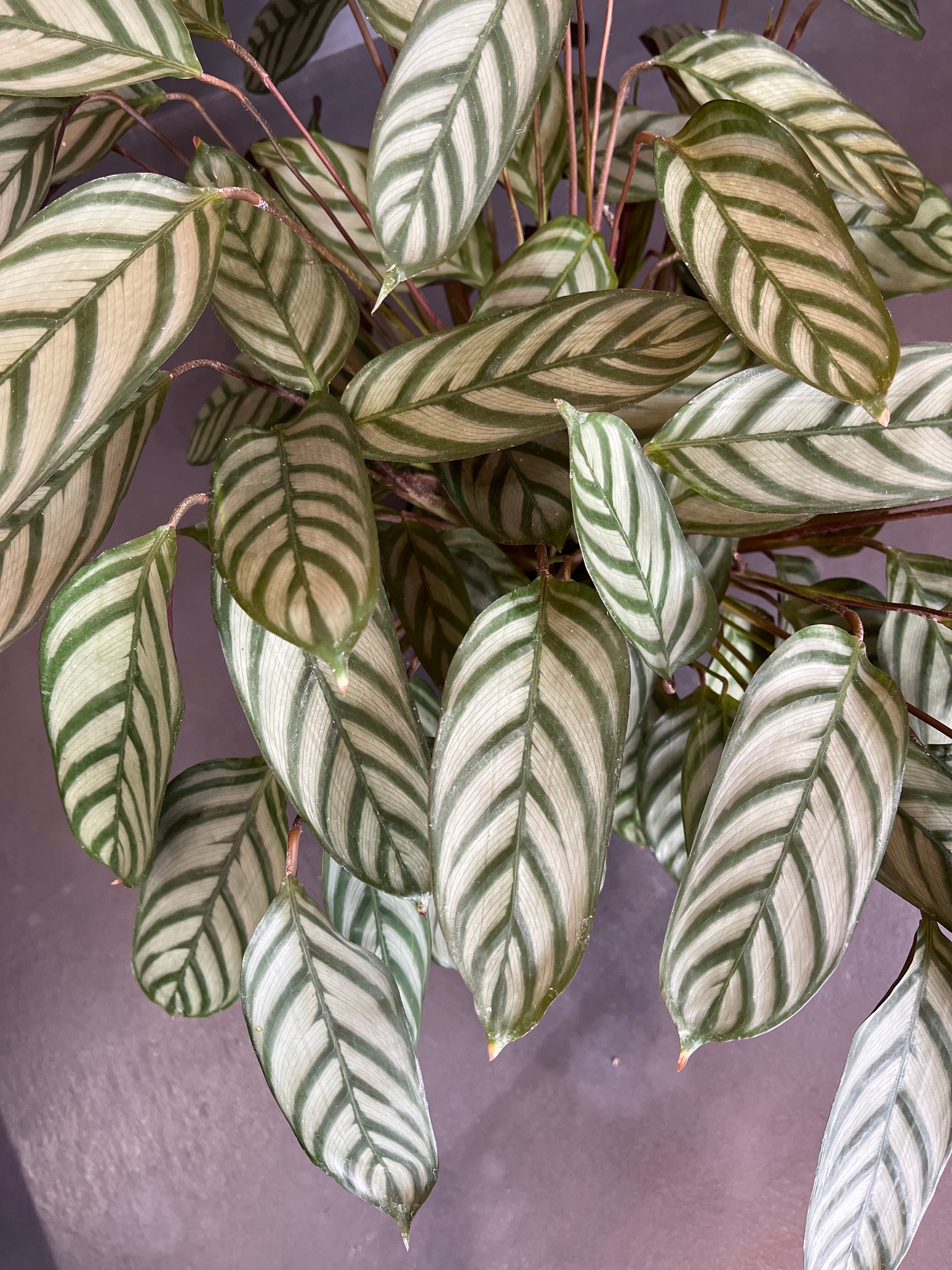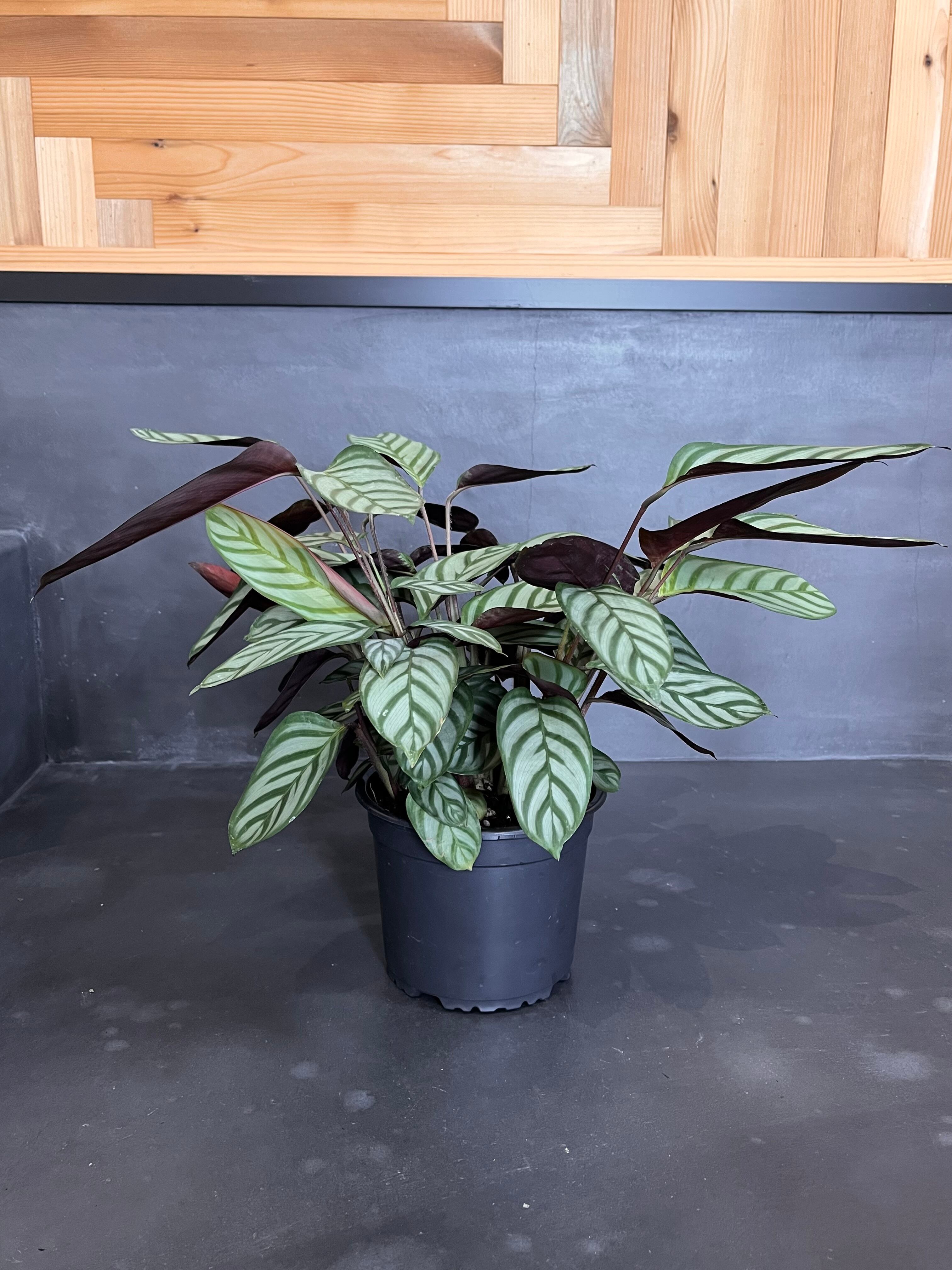 葉の裏が紫色、表面は暗緑色で、灰色の矢羽根状の斑が入る葉がきれいな種類です。