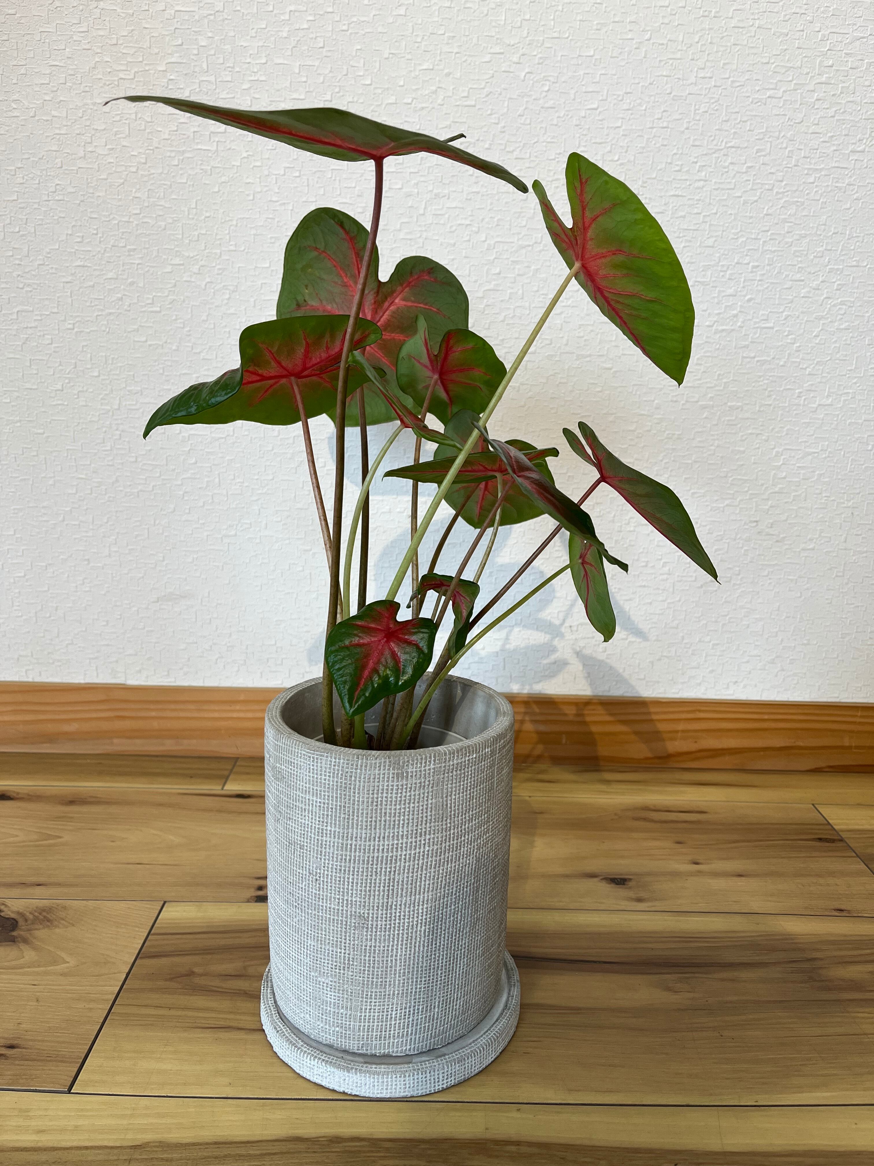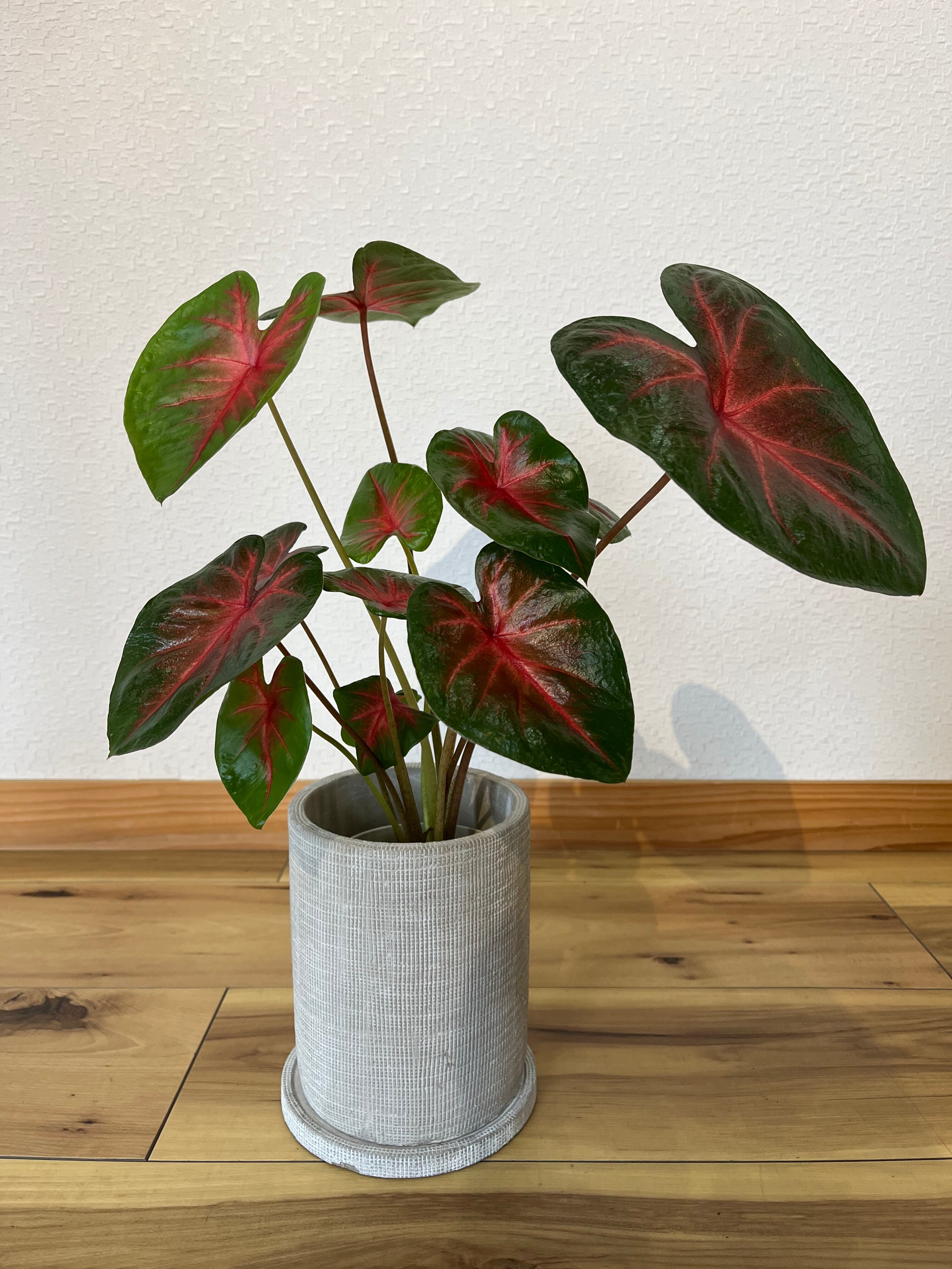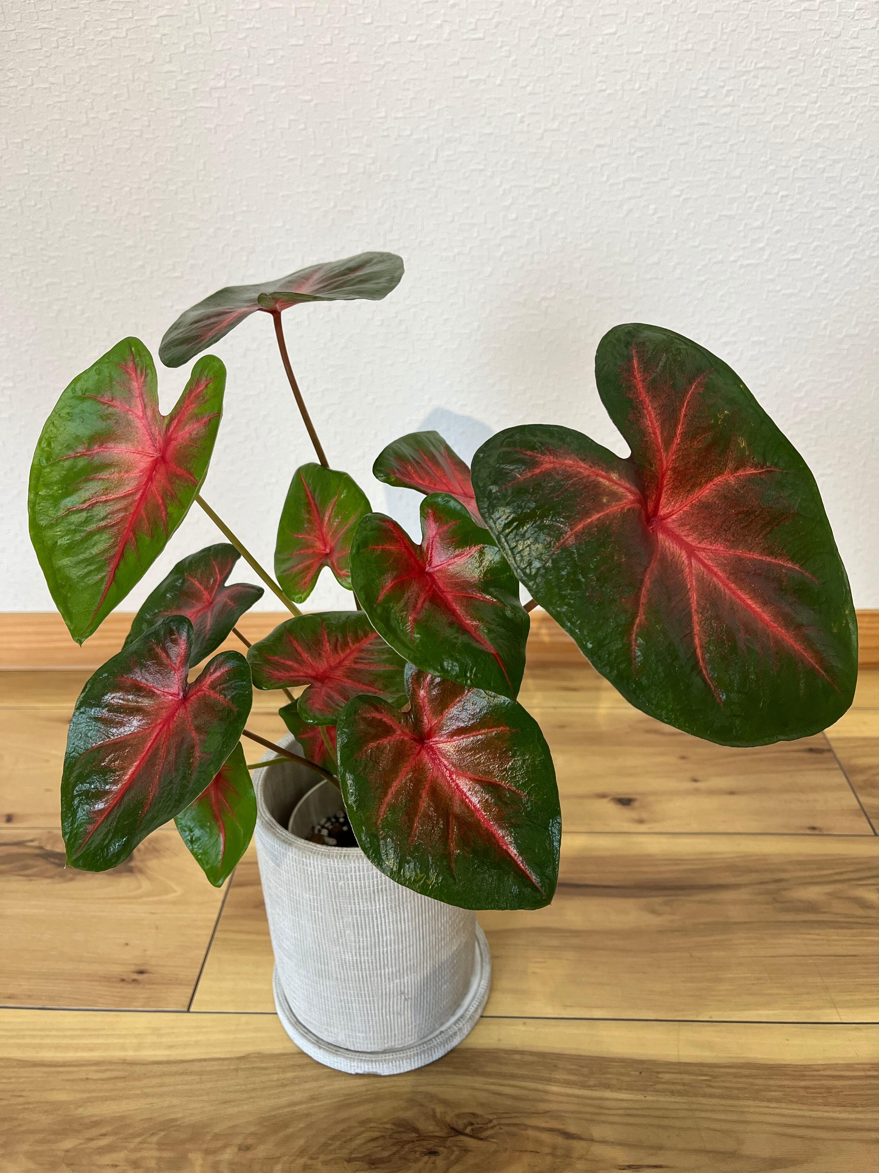 カラジウムは大きく広がるハート型の葉と、多彩な葉色が楽しいサトイモ科の観葉球根植物です。