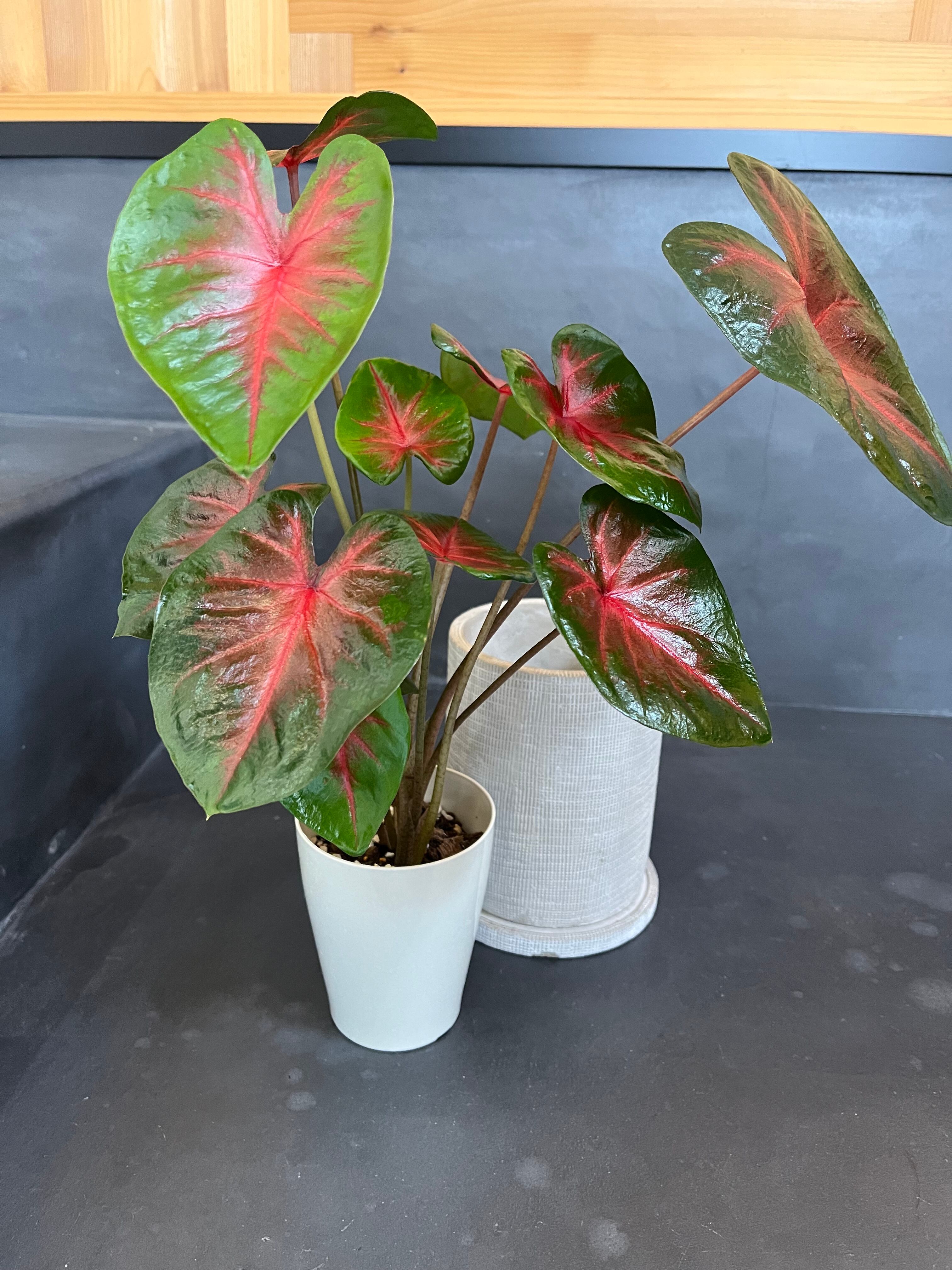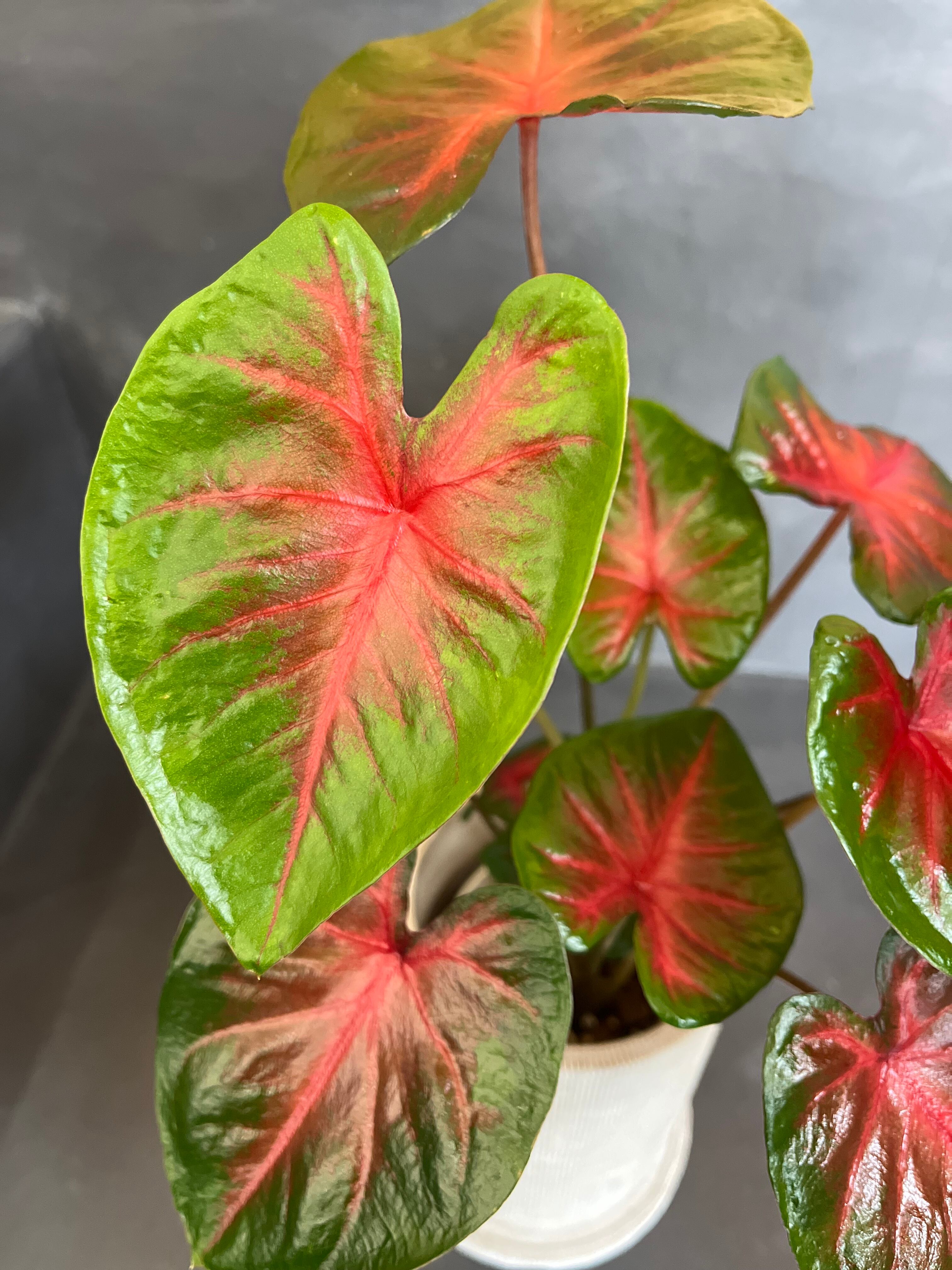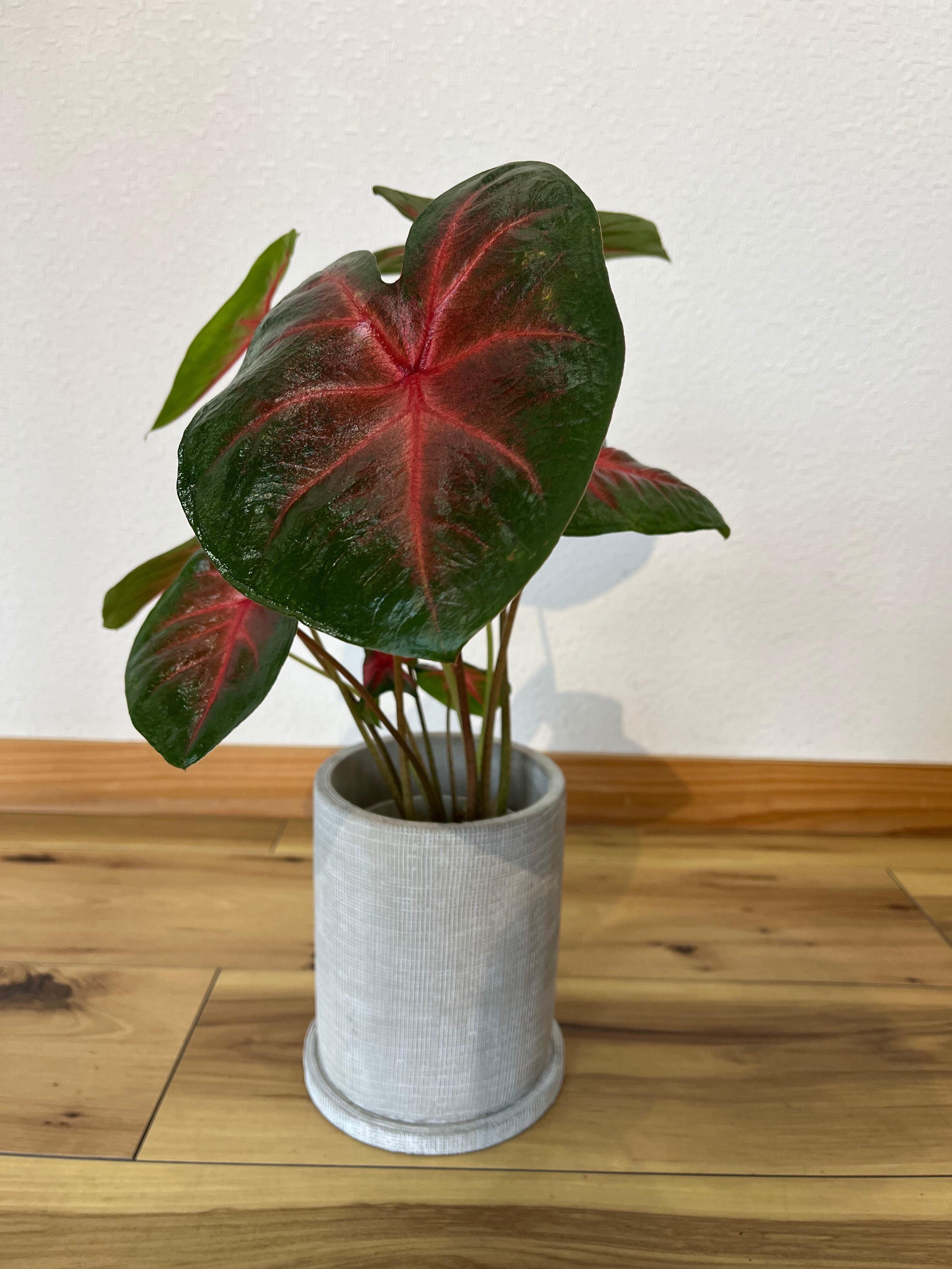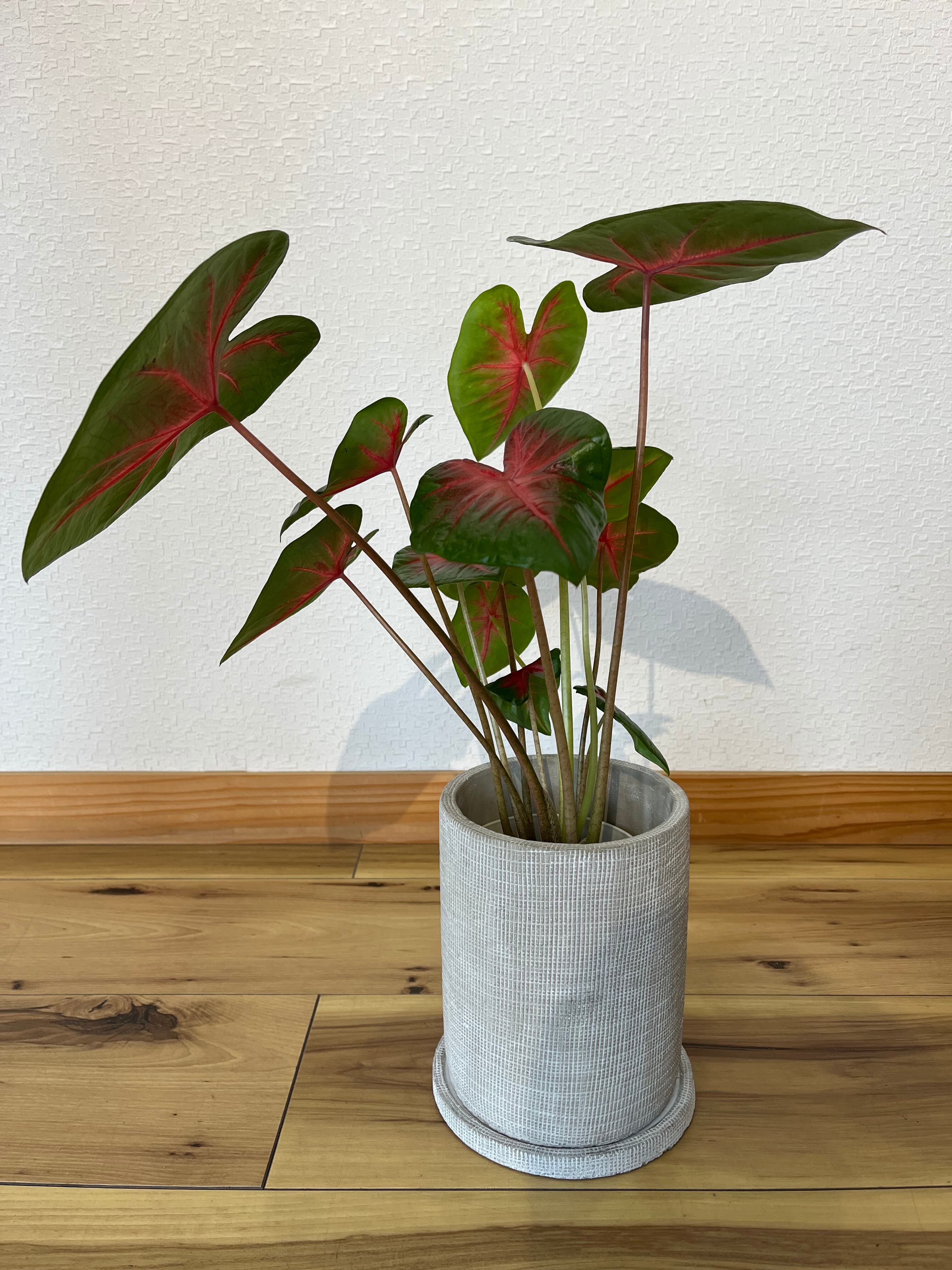 カラジウムは大きく広がるハート型の葉と、多彩な葉色が楽しいサトイモ科の観葉球根植物です。