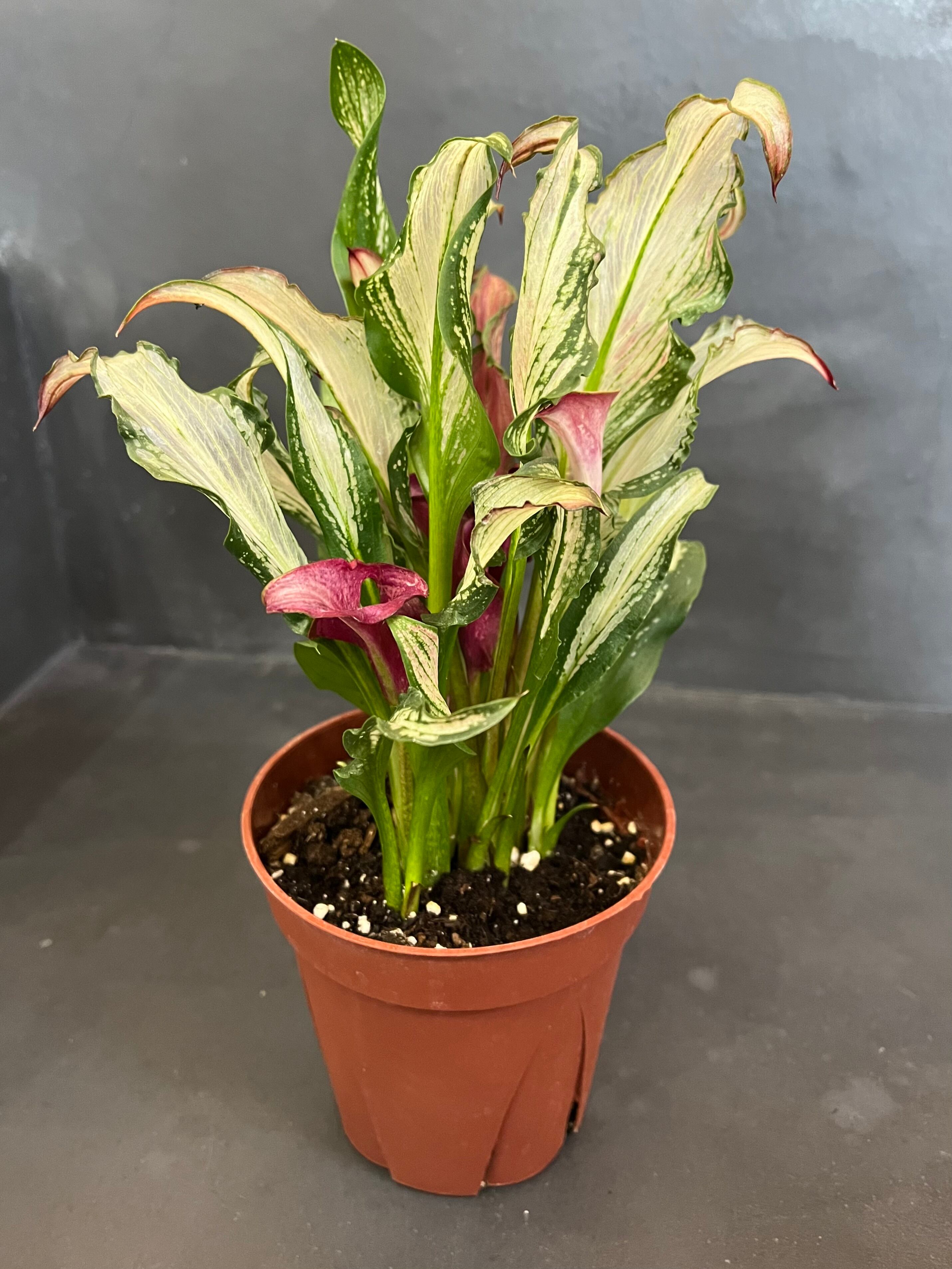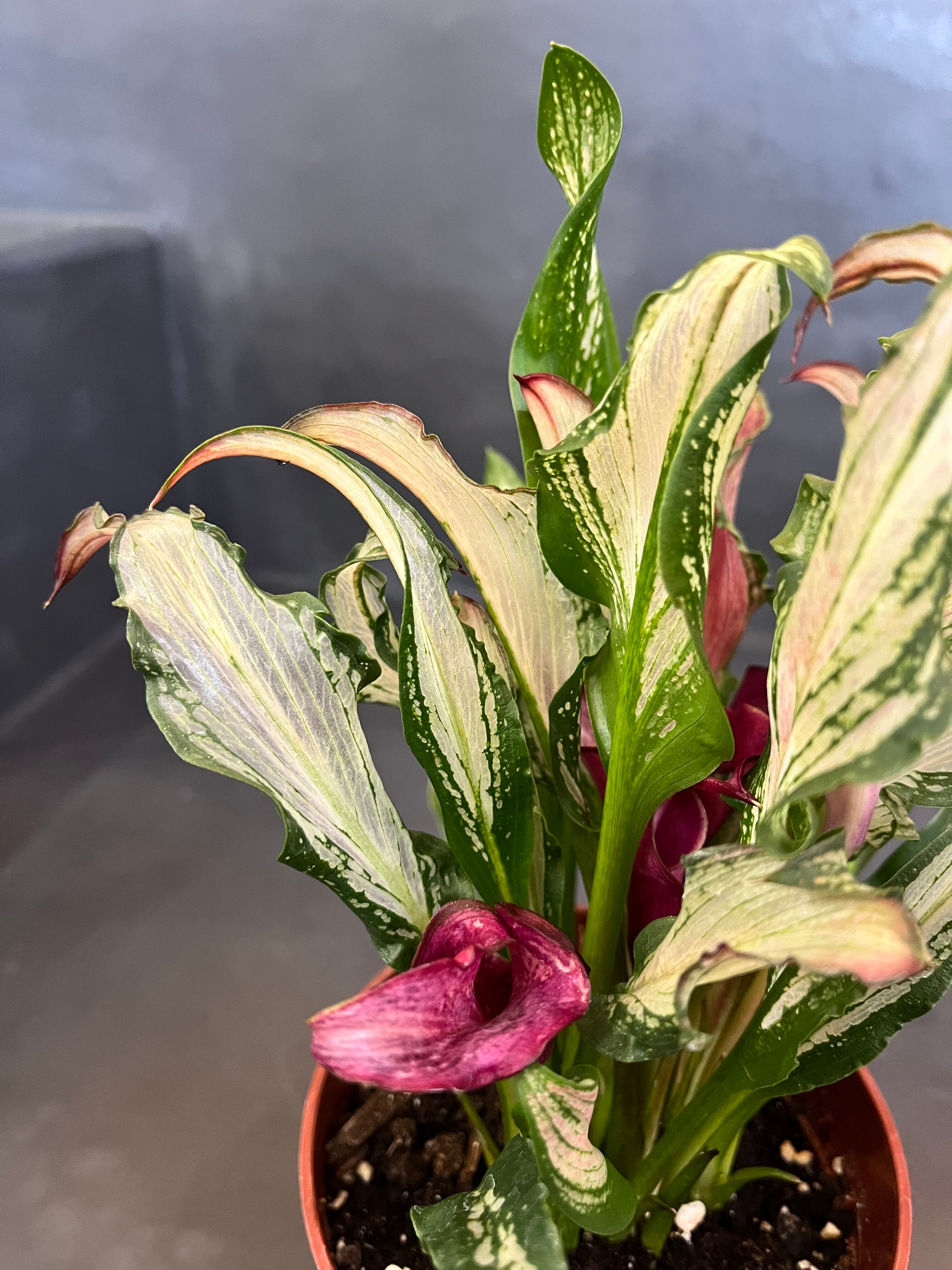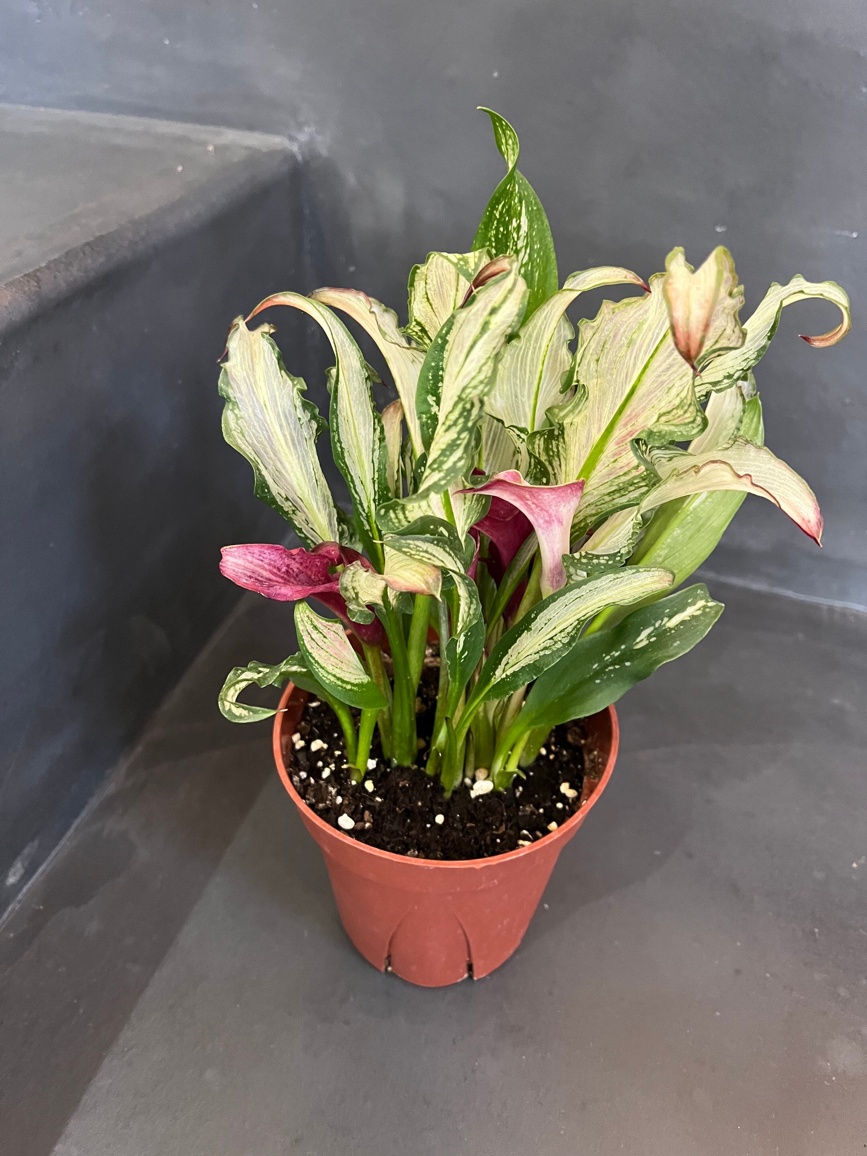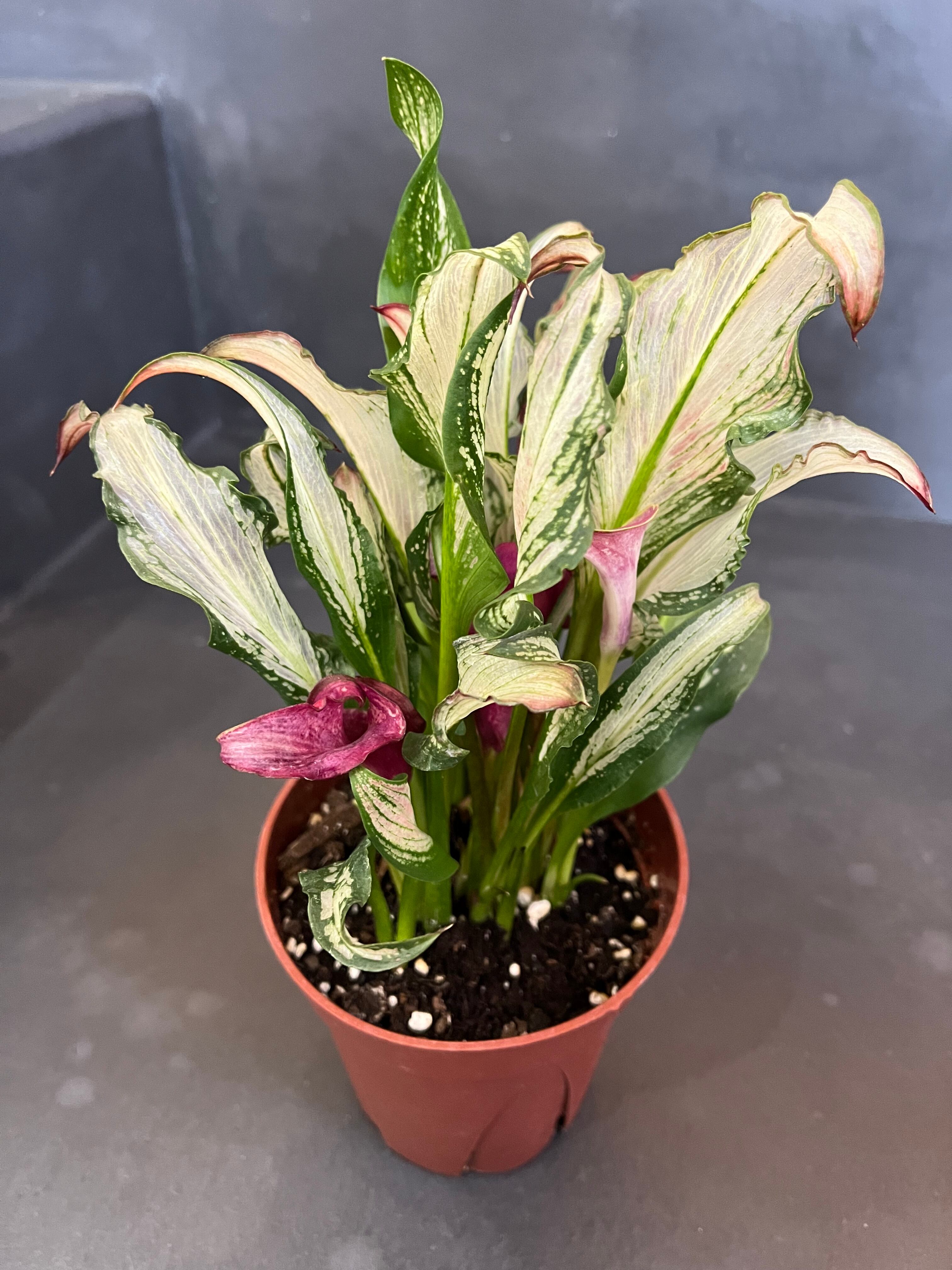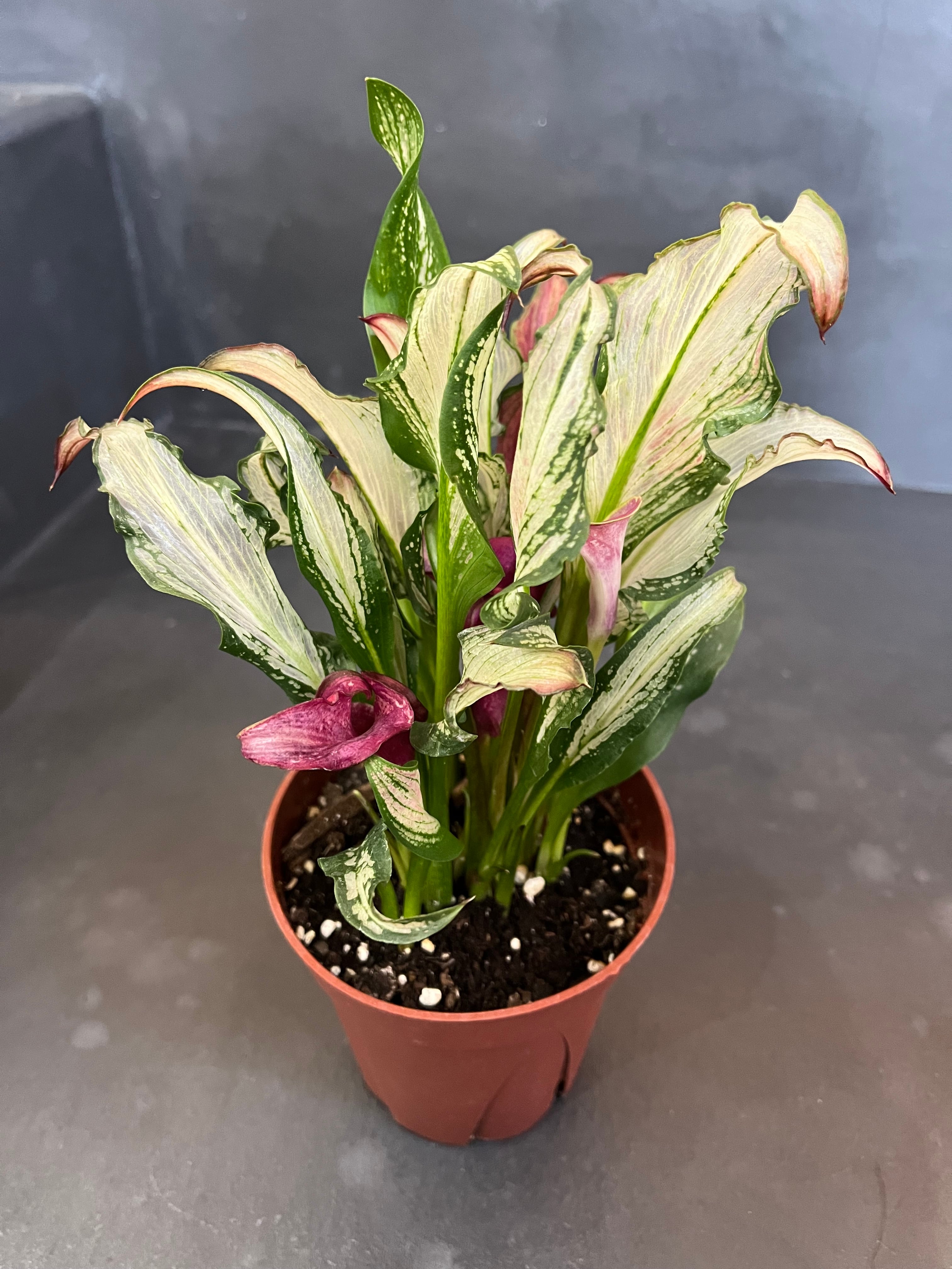 いままでのカラーのイメージとは一味違った、透明な葉をもつ涼しげな新品種のカラーです。半透明な白斑入りの葉と紫の花のコントラストが非常に美しい、新種の希少種です。