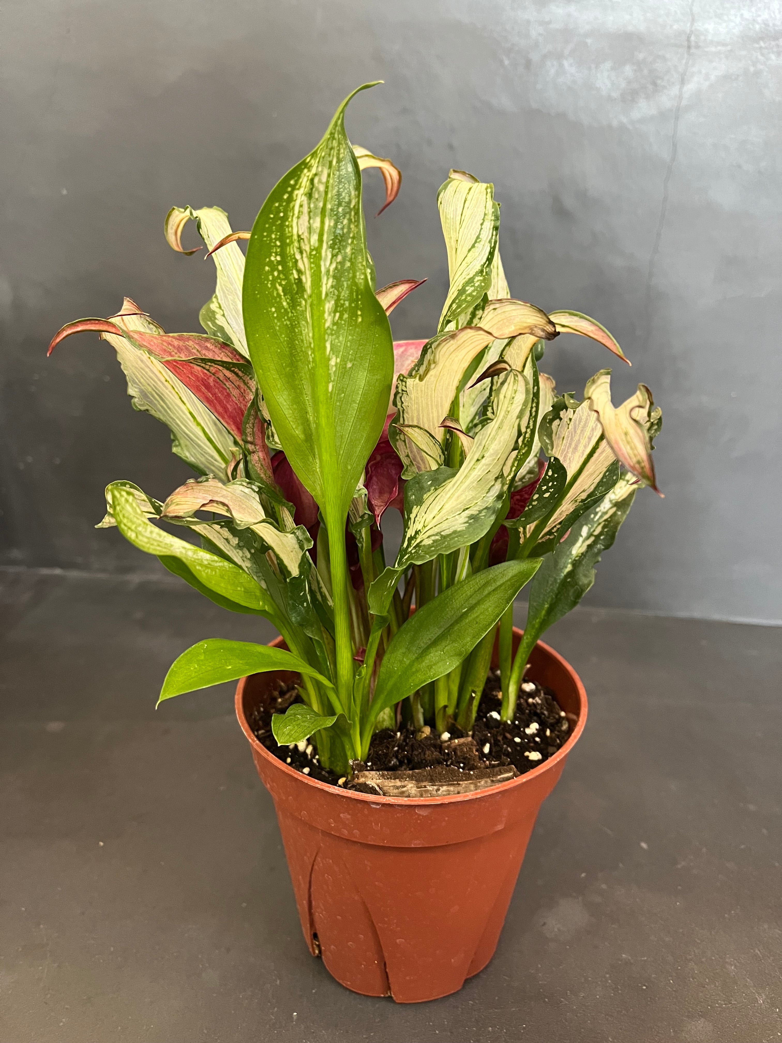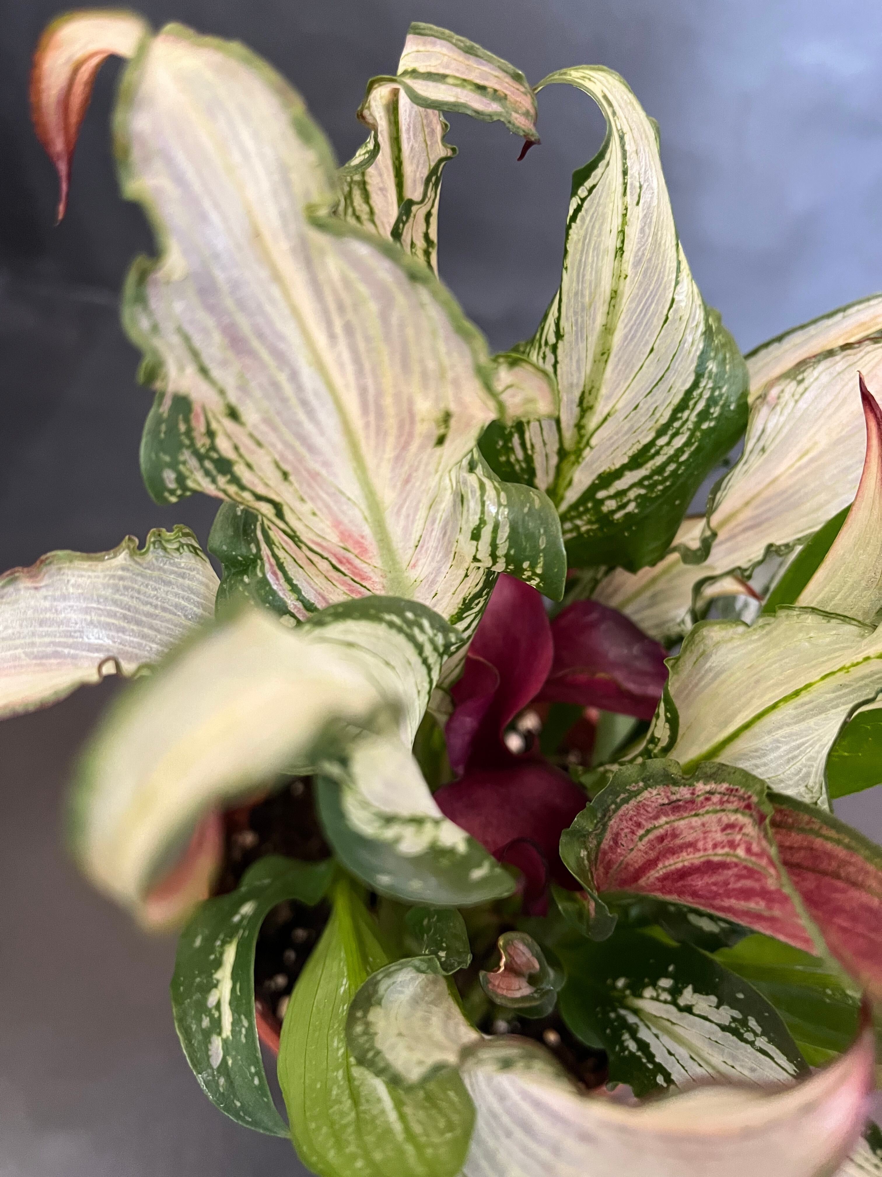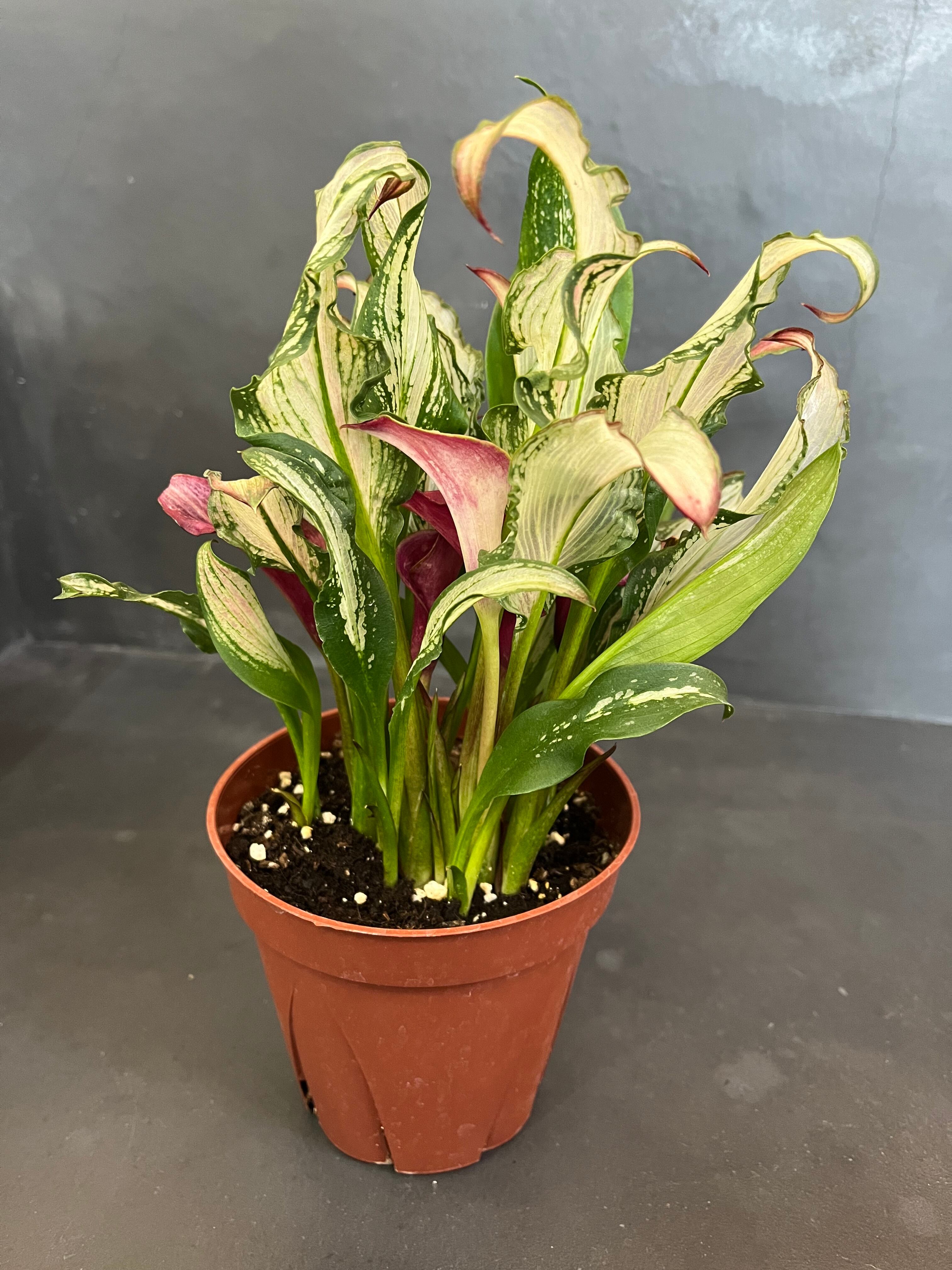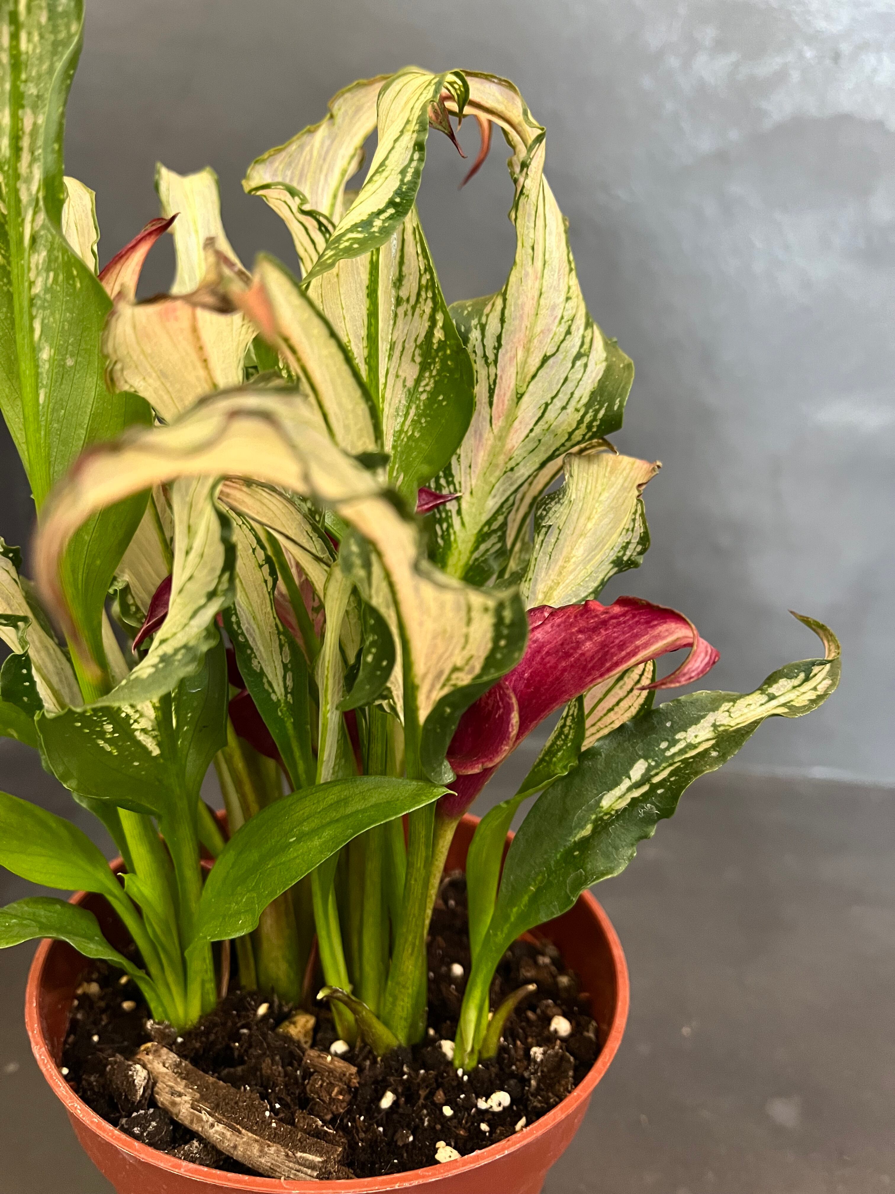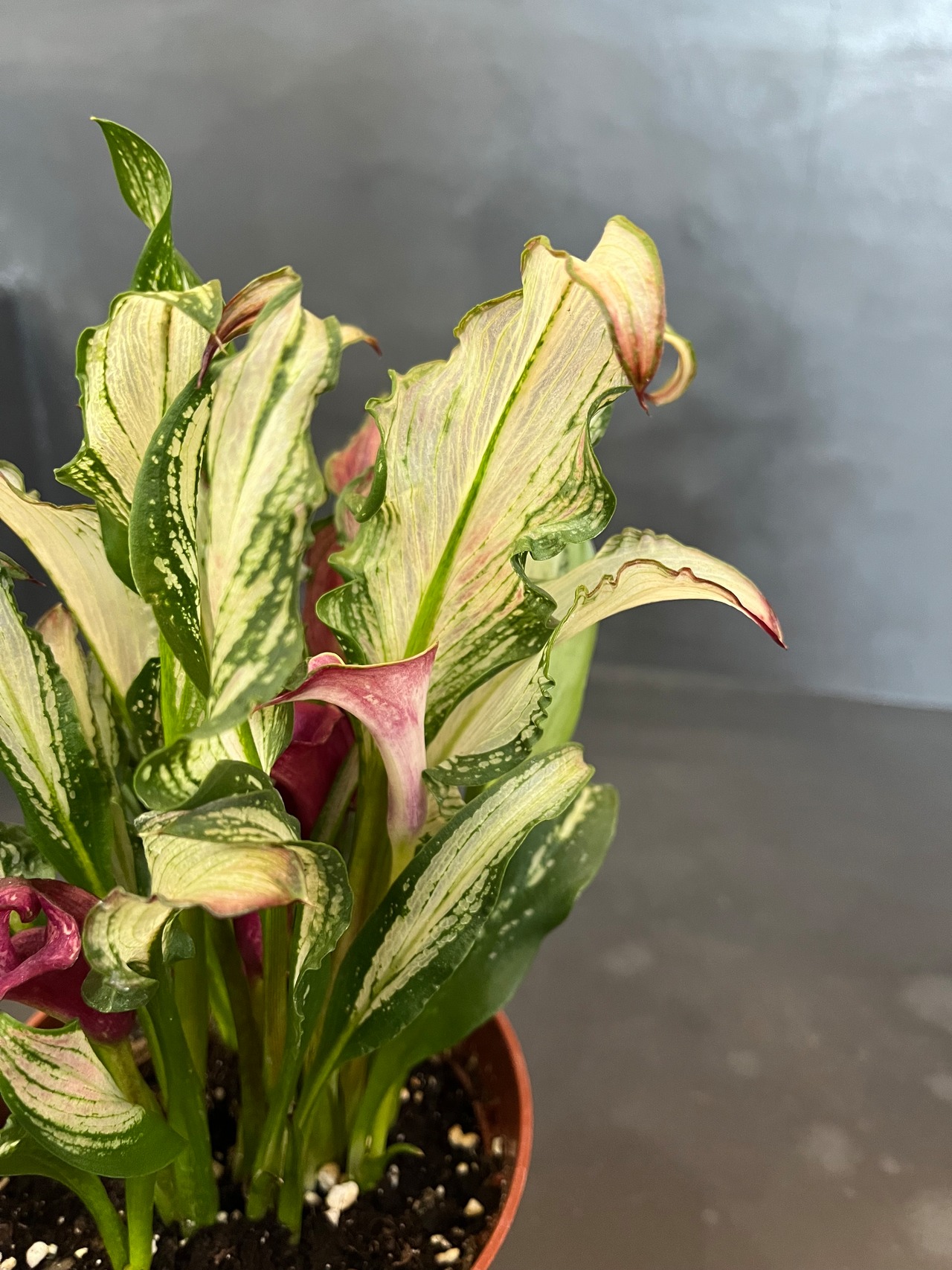 いままでのカラーのイメージとは一味違った、透明な葉をもつ涼しげな新品種のカラーです。半透明な白斑入りの葉と紫の花のコントラストが非常に美しい、新種の希少種です。