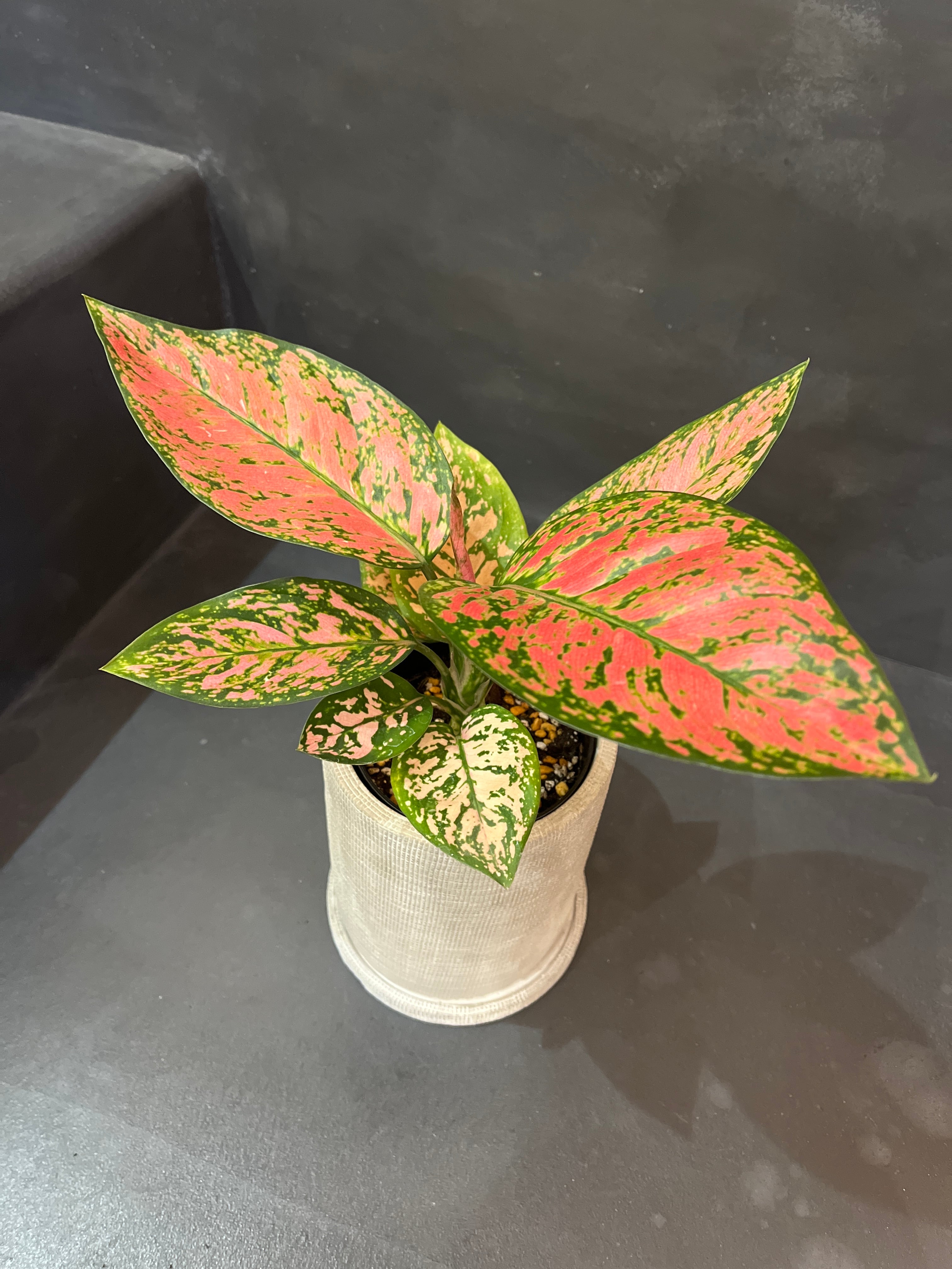 アグラオネマは葉の模様や色合いを楽しむことができ、特にこのレディーバレンタインは、緑とピンクの美しい対比が印象的で、ひときわピンクの斑が鮮やかな人気のある品種です。
